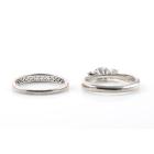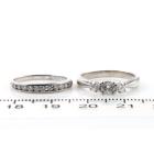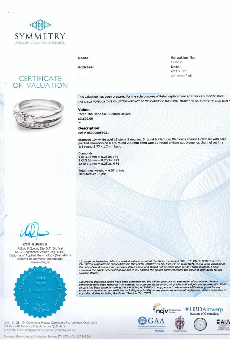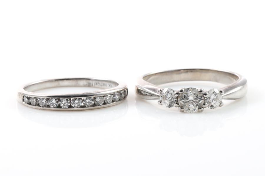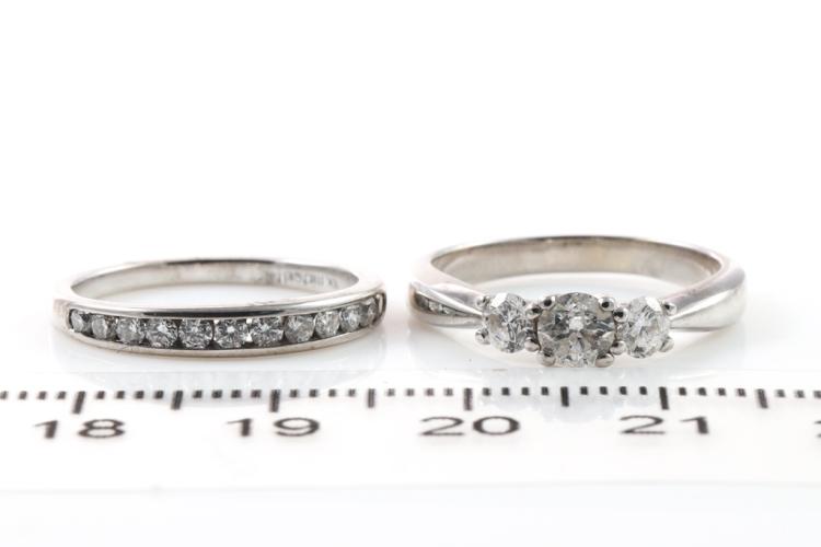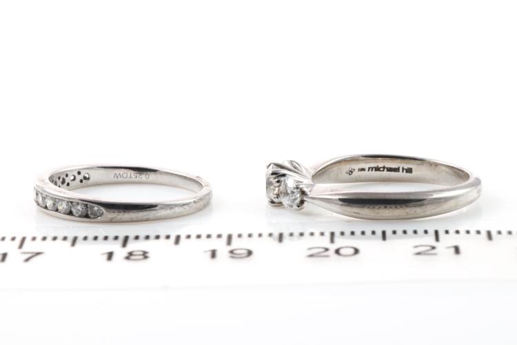 Set of 2 Michael Hill Diamond rings. Diamond trilogy ring set with 3 round Natural Diamonds totalling 0.50cts (Estimated grading: H-I P1-2). Together with matching eternity ring with 12 round Natural Diamonds totalling 0.25cts. Combined weight: 4.1g. 10ct white gold. Band width: 2.2mm-2.9mm & 1.5mm-2.5mm. Both inscribed "Michael Hill". Ring size I & I1/2. With Valuation Certificate #052900056921.