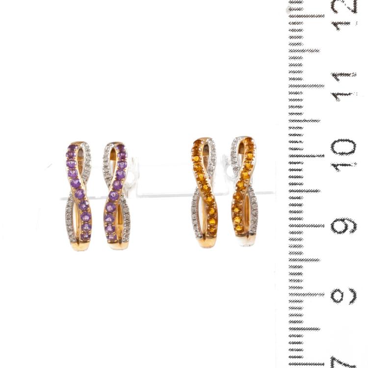 A set of 2 earrings: 1) Citrine & Diamond hoop earrings with round natural Citrine (1.5mm) totalling approx. 0.20ct & natural Diamonds totalling 0.10ct. 2) Amethyst & Diamond hoop earrings with round natural Amethysts (1.5mm x 1.5mm) totalling approx. T0.18ts & natural Diamonds totalling 0.10ct. 9ct yellow gold. Combined weight: 4.0g. (As new)