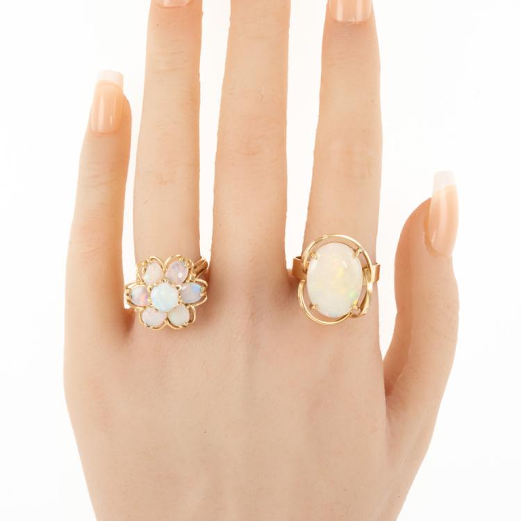 Two Opal ring set. A floral design ring with 1 round & 6 oval solid natural white Opals totalling 2.58cts, ring size: P1/2, band width: 2mm - 3.4mm, weight: 4.6g. And a Opal ring with oval solid natural white Opal of 4.65cts (17.4mm x 13.0mm), ring size: S, band width: 2.7mm - 4.9mm, weight: 5.1g. Both 9ct yellow gold. Total weight: 9.7g. With copy of GSL valuation #AA 63603 item 14 & 15. (Pre-Owned)^