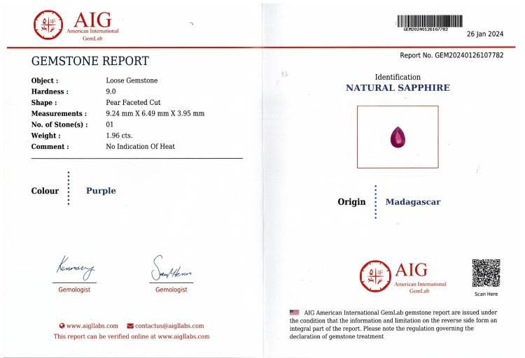 A loose pear shape purple unheated Madagascar Natural Sapphire of 1.96ct (with AIG report #GEM20240126107782 stating origin: Madagascar). (As new)
