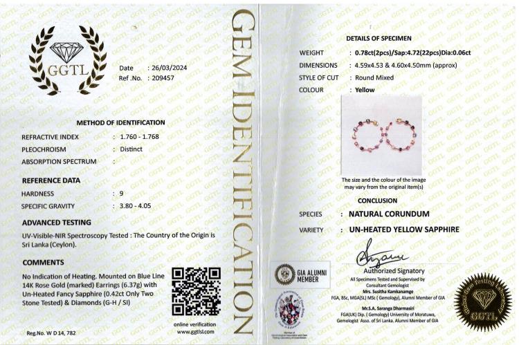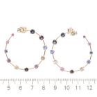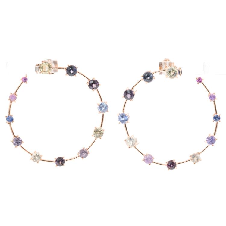 Hoop earrings with round multi-colour Ceylonese Natural unheated Sapphires totalling 5.50ct (only two sapphires tested) and 2 baguette cut Natural Diamonds totalling 0.06ct. 14ct rose gold. Weight: 6.3g. With GGTL report #209457. (As new)