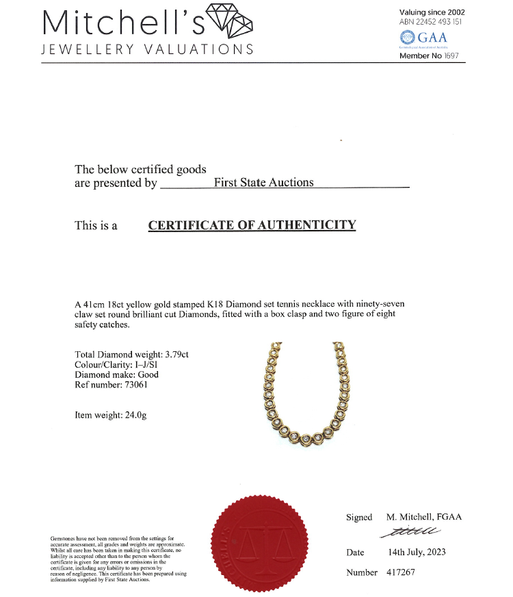 Diamond tennis necklace with round natural Diamonds totalling 3.79ct (Estimated grading: I-J SI). 18ct yellow gold. Length: 41cm. Weight: 24.0g. With Certificate #417267. (Pre-owned)