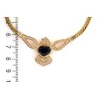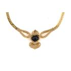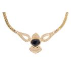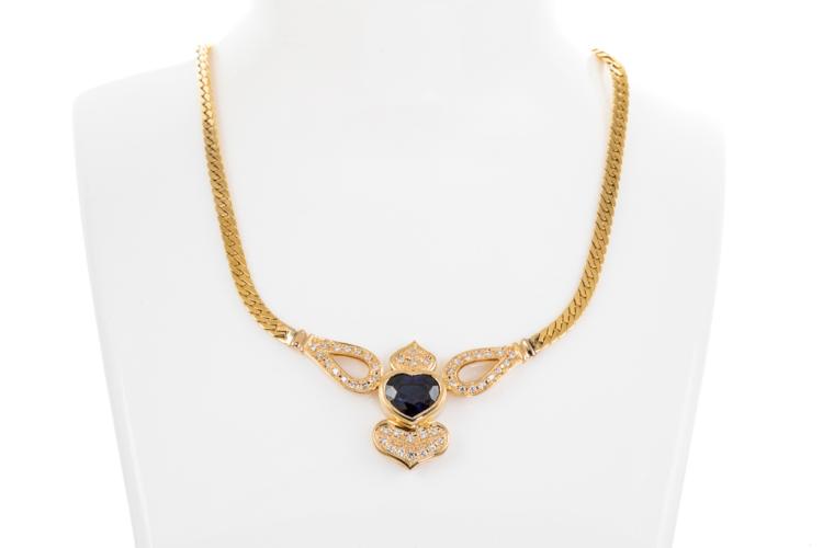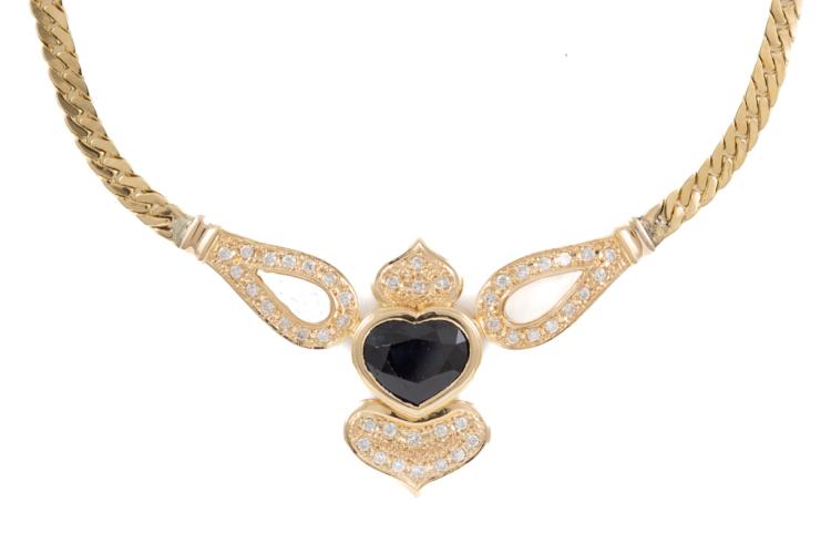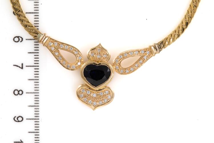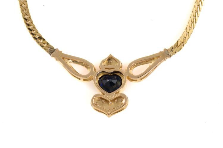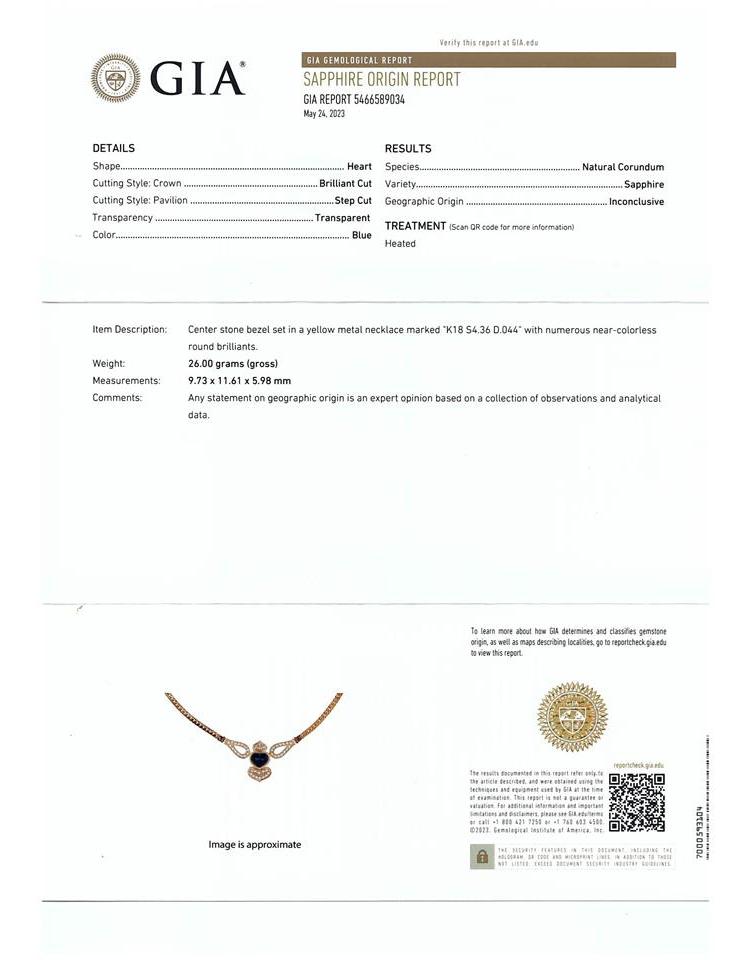Sapphire and Diamond necklace with heart shape blue Natural Sapphire of 4.36ct and round Diamonds totalling 0.44cts (Estimated grading: H SI). 18ct yellow gold. Length: 44cm. Weight: 26.0g. With GIA report #5466589034. (Pre-owned)