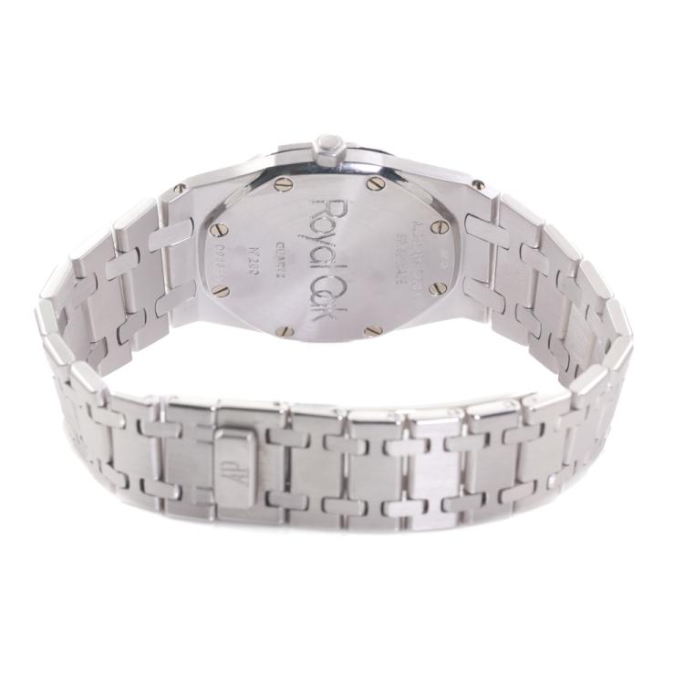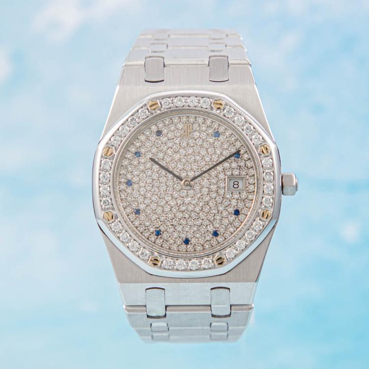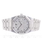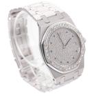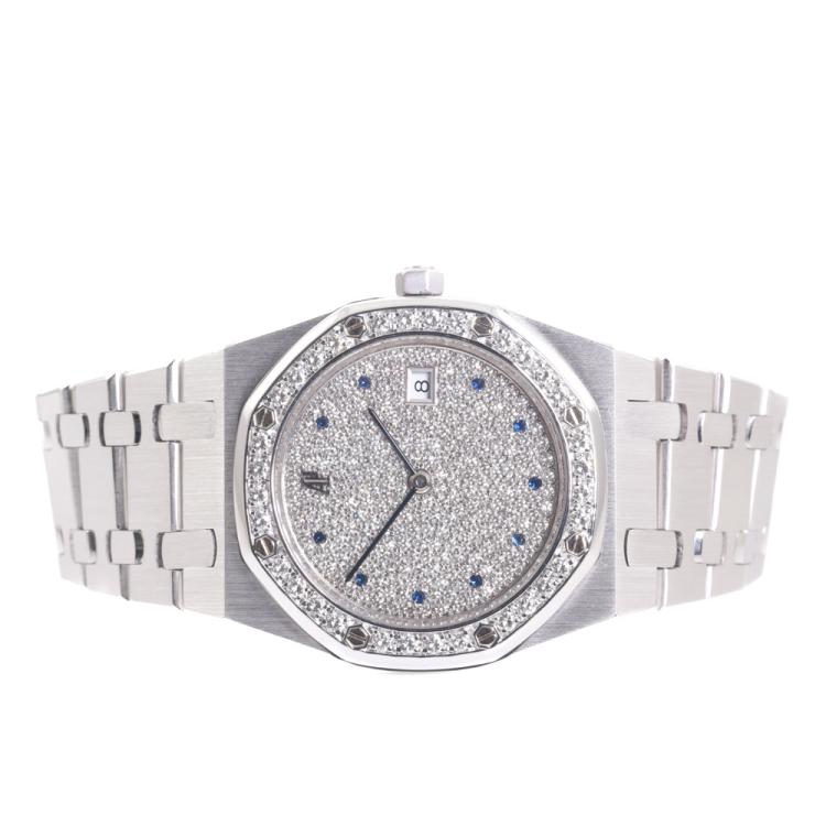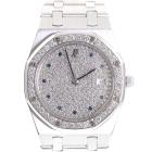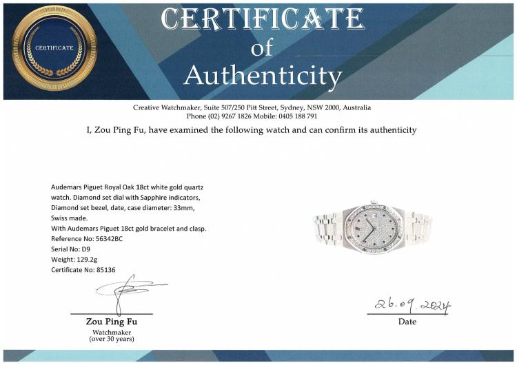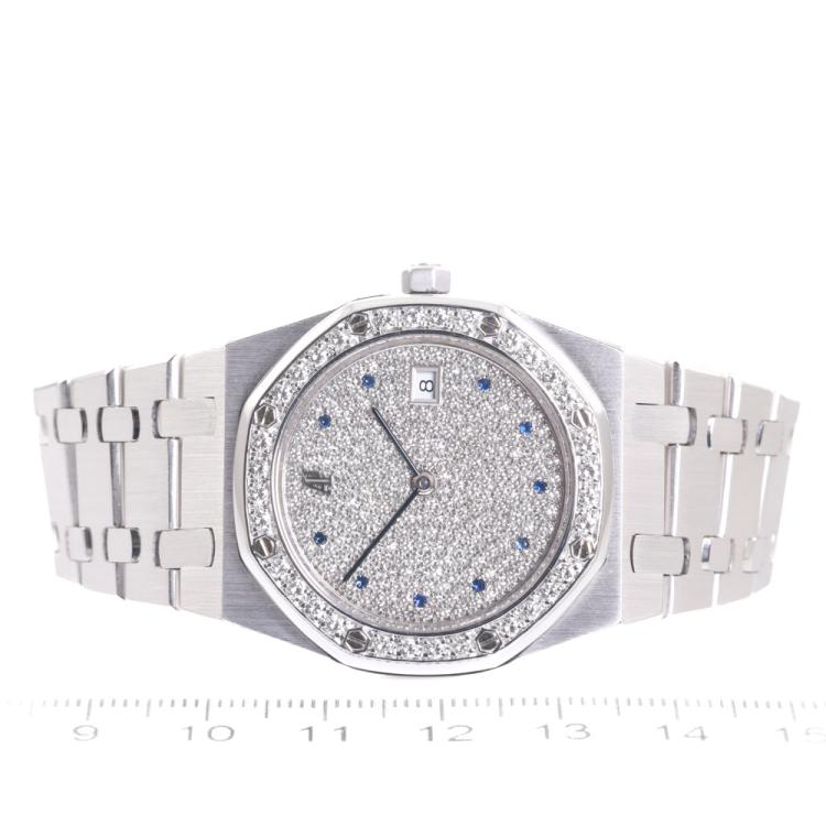 Audemars Piguet Royal Oak 18ct white gold quartz watch. Diamond set dial with Sapphire indicators, Diamond set bezel, date, case diameter: 33mm, wrist size: 16cm, Swiss made. Ref# 56342BC. With Audemars Piguet 18ct white gold bracelet and clasp. With Certificate of Authenticity. 3 month FSA warranty. (Pre-owned)