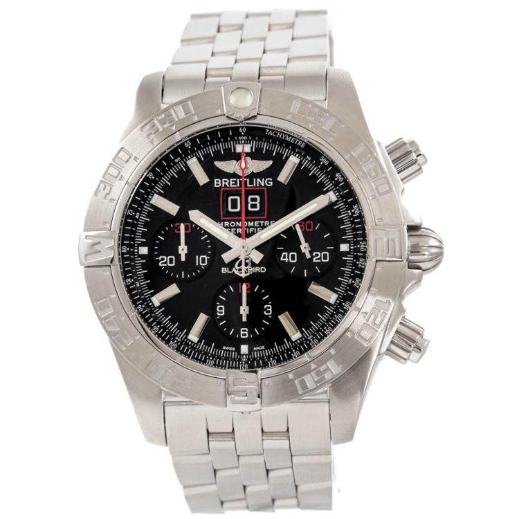 Breitling Blackbird stainless steel Limited Edition of 2000 automatic mens watch. Black chronograph dial, date, case diameter: 44mm, wrist size: 20cm, Swiss made. Ref# A44360. With Breitling stainless steel bracelet and clasp. With Breitling International Warranty card, Dated 23/01/2013, Certificate of Authenticity and Breitling box. 3 month FSA warranty (Pre-owned)