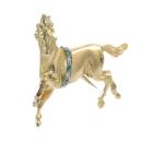 Horse design brooch with round Natural Diamonds totalling approximately 0.02ct and round Natural Emeralds totalling approximately 0.03ct. 18ct yellow gold. Weight: 9.0g. (Pre-owned)