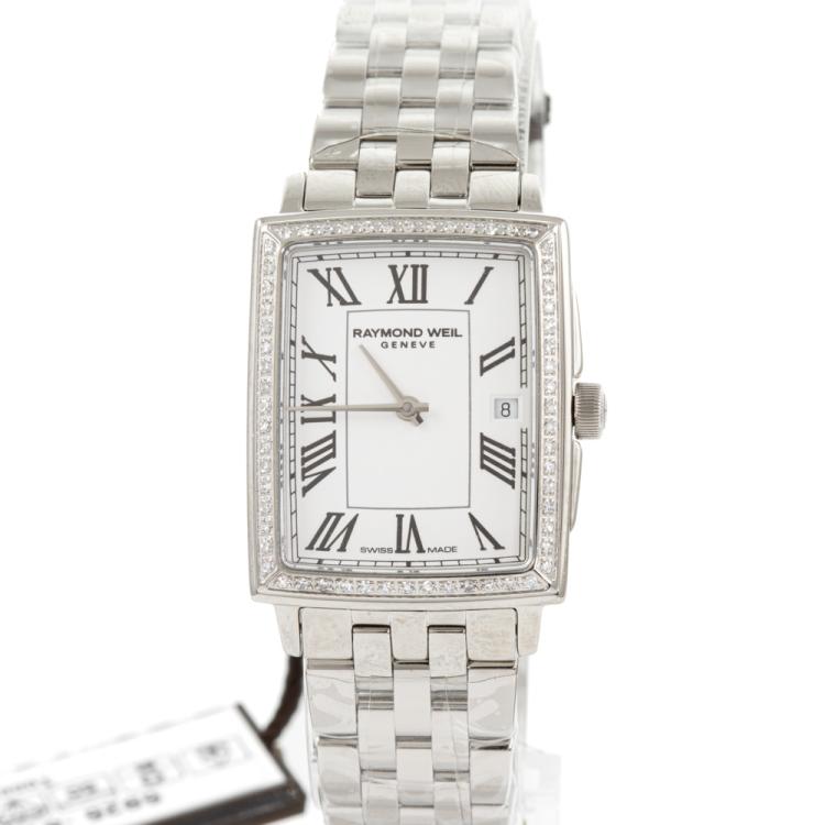 Raymond Weil Toccata stainless steel quartz ladies watch. White dial, Diamond set bezel, date, case diameter: 28.1mm, x 22.6mm, wrist size: 17.5cm, Swiss made. Ref# 5925-STS-00300. With Raymond Weil stainless steel bracelet and clasp. With Undated Raymond Weil Guarantee card, Raymond Weil Certificate of Authenticity and Raymond Weil box. 12 month FSA warranty (As new, Note: case and bracelet in original wrapping)