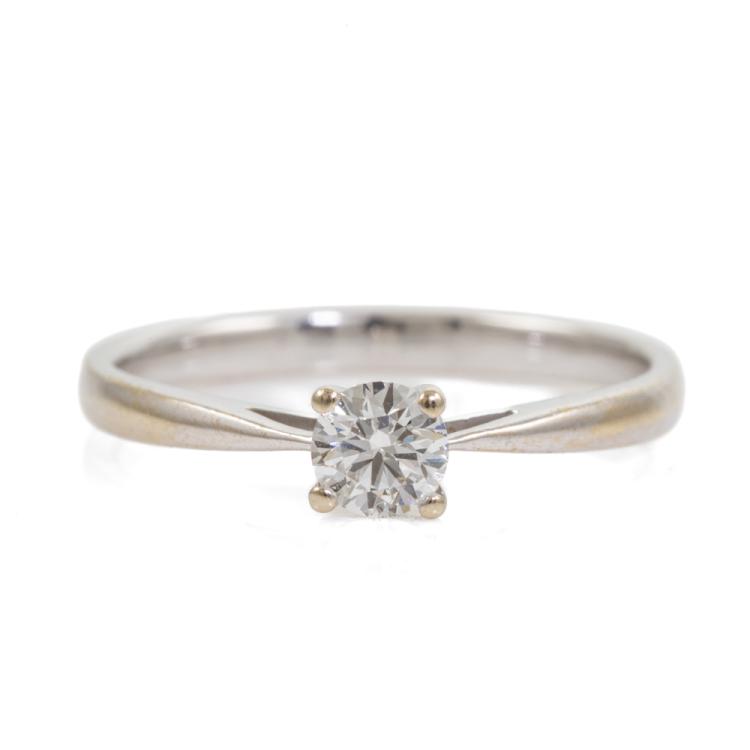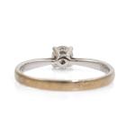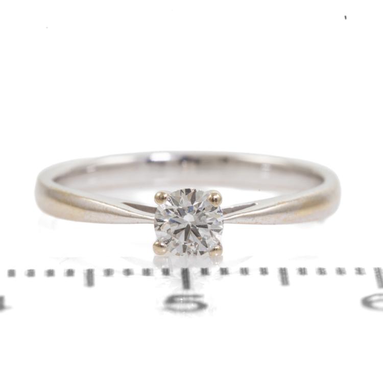 Diamond solitaire ring with a round Natural Diamond of 0.18ct. 18ct white gold. Ring size G. Band width: 1.7mm. Note rhodium plating faded on band. Weight: 1.4g. (Pre-owned)