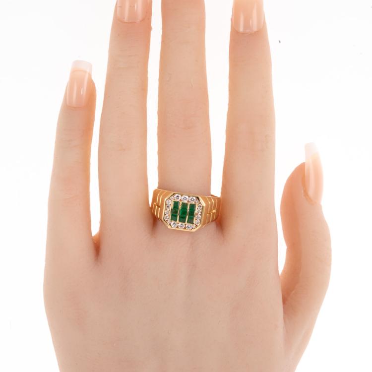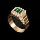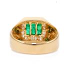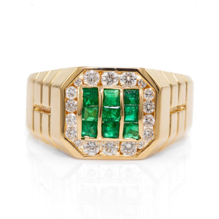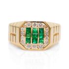 Mens ring with emerald cut Natural Emeralds totalling 0.65cts and round Natural Diamonds totalling 0.46cts (Estimated grading: I-J SI). 18ct yellow gold. Ring size U. Weight: 9.7g. (Pre-owned)