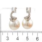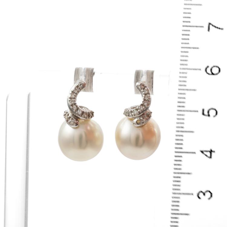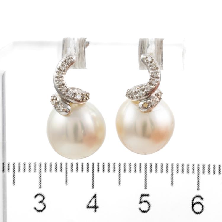 Pearl and Diamond earrings with off round South Sea Pearls of 11mm and round Natural Diamonds totalling 0.20cts. 18ct white gold (note posts slightly bent). Weight: 6.5g. (Pre-owned)