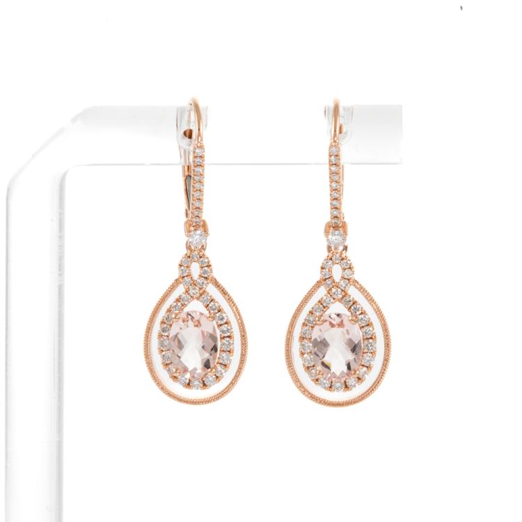 Morganite and Diamond leverback drop earrings with oval shape Natural Morganite totalling 1.25cts and round Natural Diamonds totalling 0.49cts (Estimated grading: J-K SI). 14ct rose gold. Weight: 3.0g. (New)