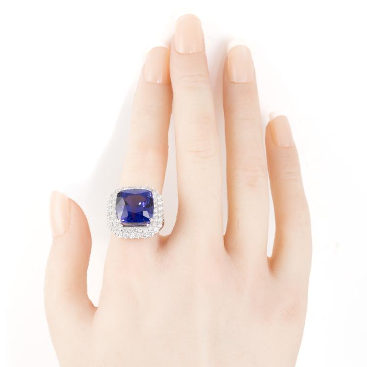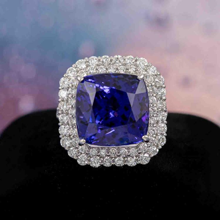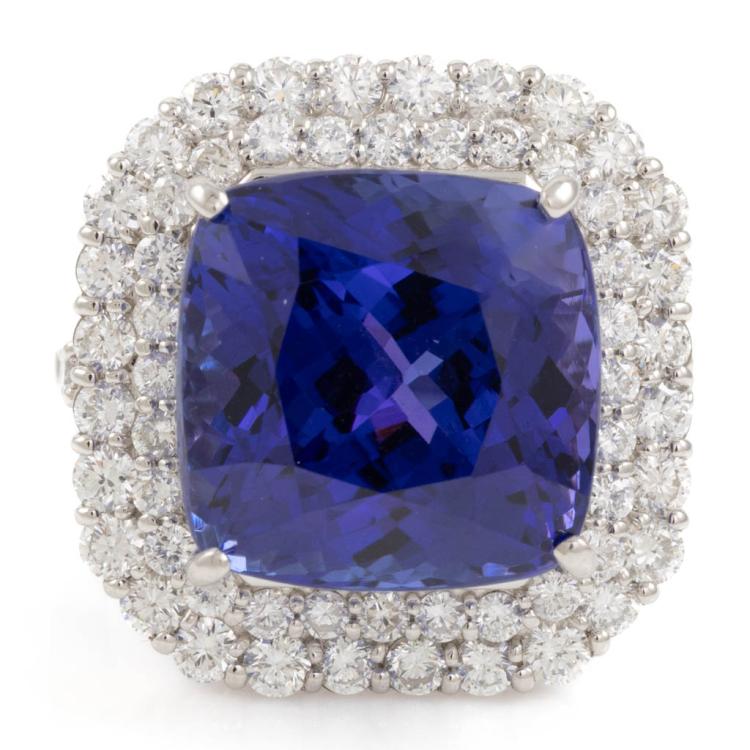 Tanzanite and Diamond ring with cushion cut Natural Tanzanite of 16.94ct and round Natural Diamonds totalling 1.79cts (Estimated grading: G-H SI). Platinum 950. Ring size K1/2 - ring resizing is not recommended. Band width: 2.1mm. Weight: 12.0g. With Certificate #418206. (Pre-owned)