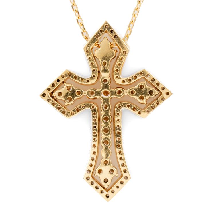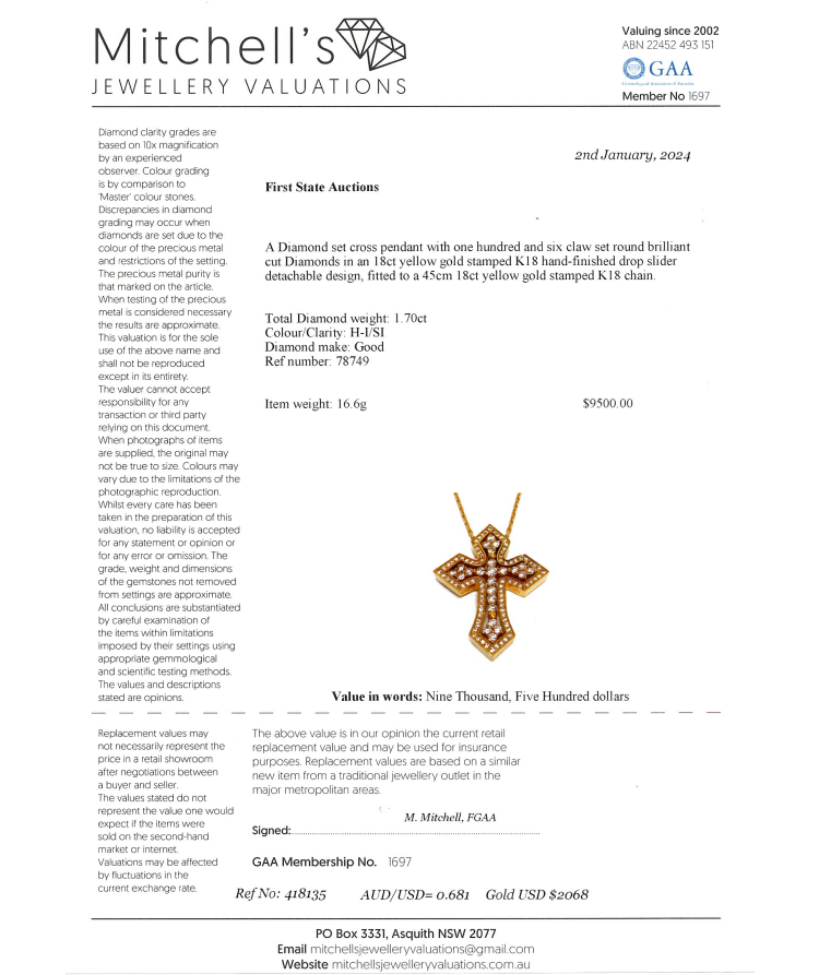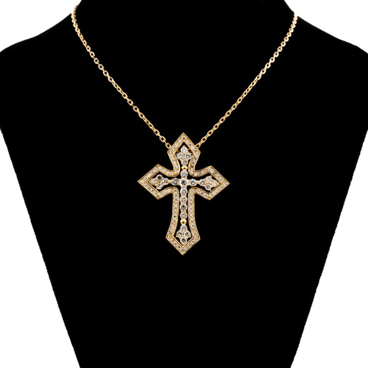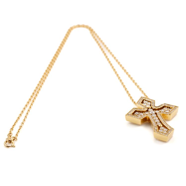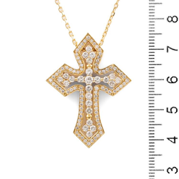 Diamond cross detachable pendant with round Natural Diamonds totalling 1.70cts (Estimated grading: H-I SI). 18ct yellow gold with 18ct yellow gold 45cm chain. Cross approximate dimension: 38mm x 28mm. Weight: 16.6g. With Certificate #418135. (Pre-owned)