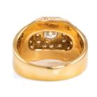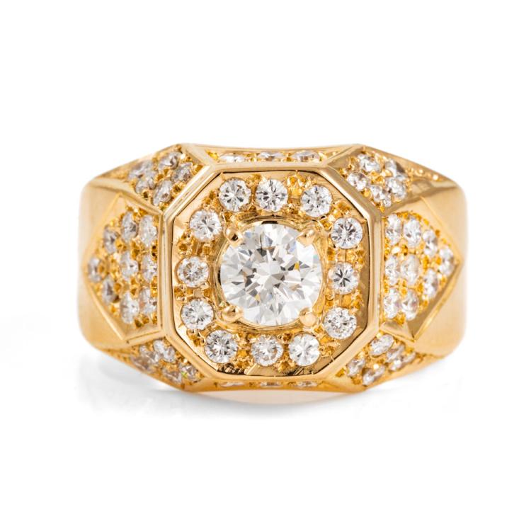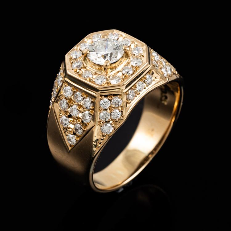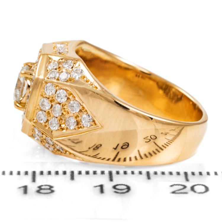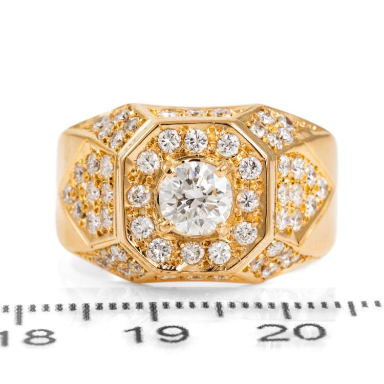 Diamond Mens ring with centre round Natural Diamond of 0.63cts (Estimated grading: G-H SI) and remaining round Natural Diamonds totalling 1.12cts (Estimated grading: G-H SI). 18ct yellow gold. Ring size Q. Band width: 8.9mm - 4.9mm. Weight: 12.5g. With Valuation Certificate 418165. With resizing mark. (Pre-owned).