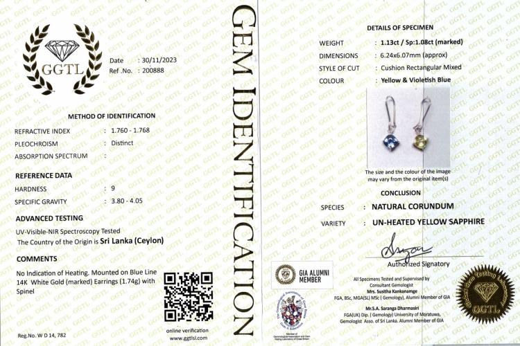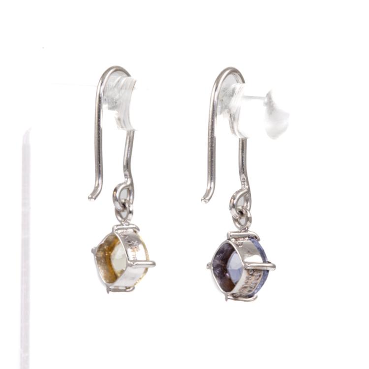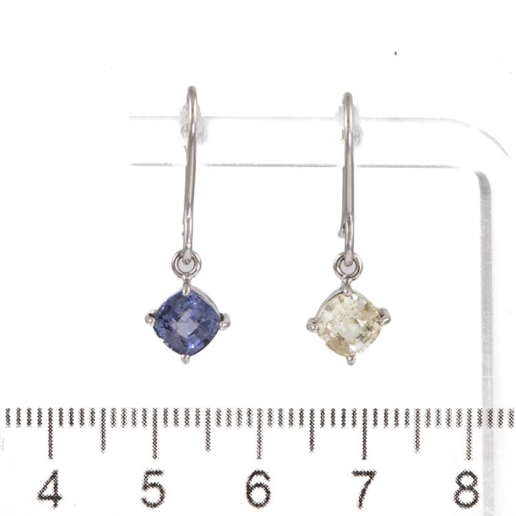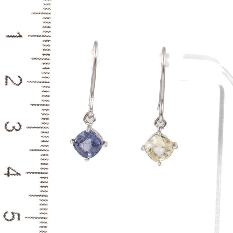 Sapphire & Spinel shepherds hook earrings with yellow cushion cut unheated Ceylon Sapphire and & violetish blue Spinel totalling 2.21cts. 14ct white gold. Weight: 1.7g. With GGTL report #200888. (As new)