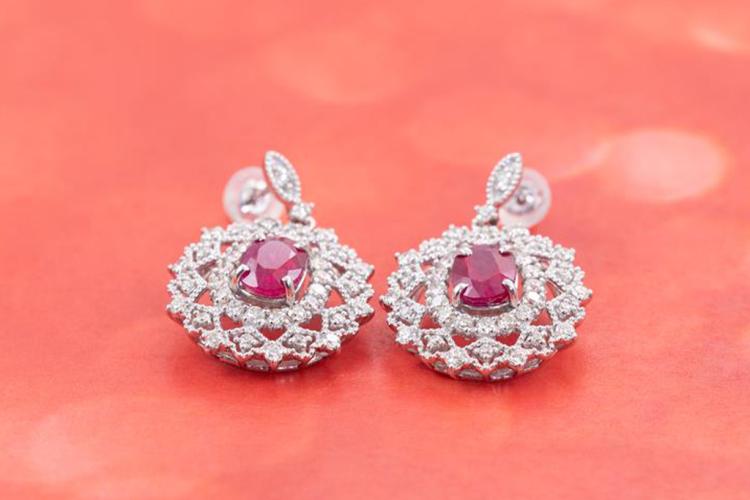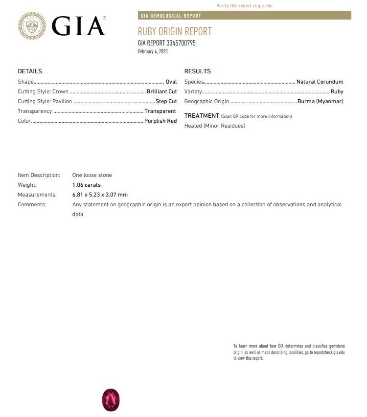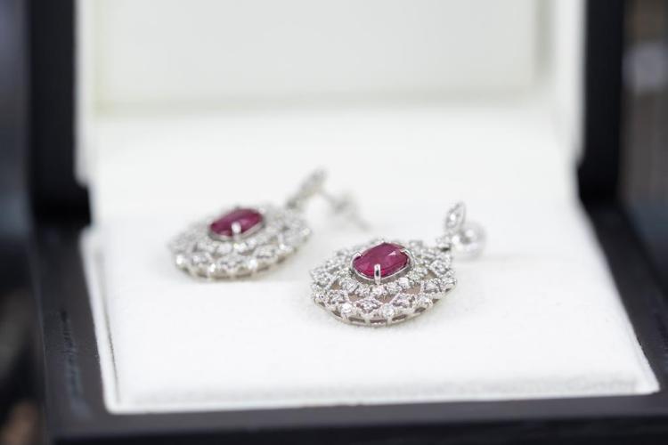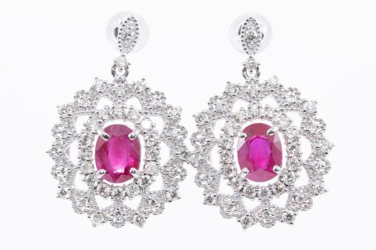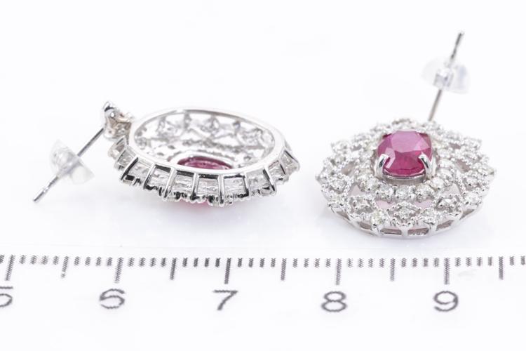 Ruby and Diamond earrings with oval shape purplish red Natural Burmese Rubies totalling 2.23cts (both with GIA reports #3345700795, 2347700792) and round Natural Diamonds totalling 1.00cts (Estimated grading: J-K SI). Platinum with 18ct white gold & silicon backs. Weight: 7.3g. (Pre-owned)