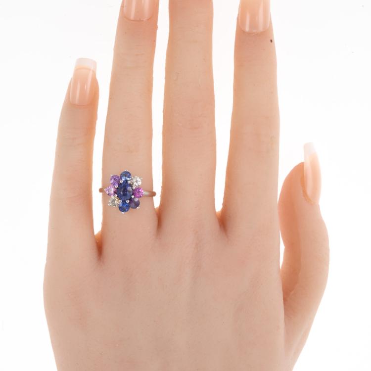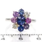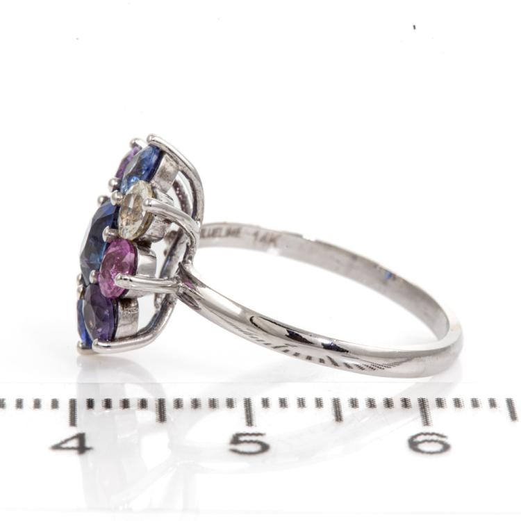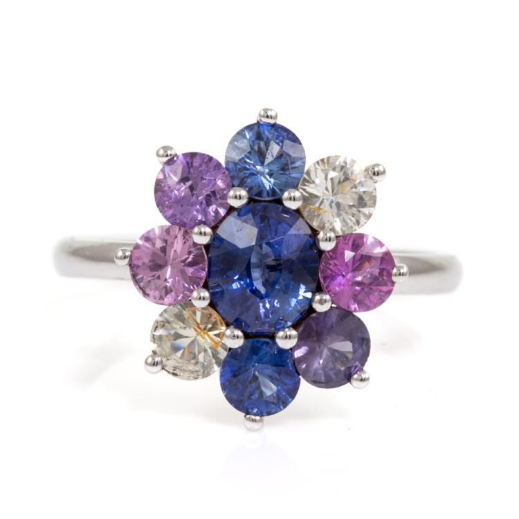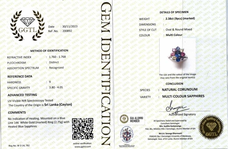 Sapphire ring with 9 round & oval shape multi-colour Ceylon Natural Sapphires totalling 2.38cts. 14ct white gold. Ring size K. Band width: 1.8mm. With GGTL Report #200892, note - 8 Sapphires are unheated and 1 blue Sapphire heated. Weight: 2.7g. (As new)