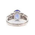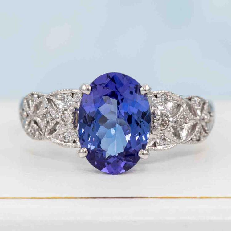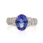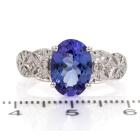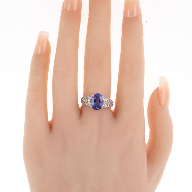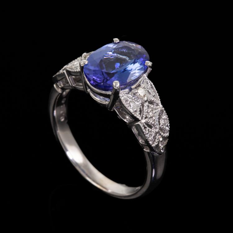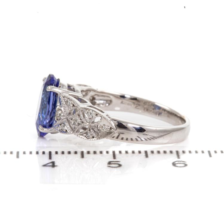 Tanzanite and Diamond ring with oval Natural Tanzanite of 2.62ct and round Natural Diamonds totalling 0.12cts. 18ct white gold. Ring size N. Band width: 3.4mm - 2.5mm. Weight: 5.9g. (Pre-owned)