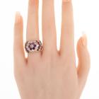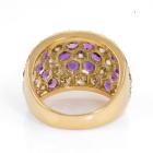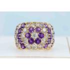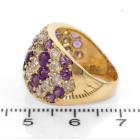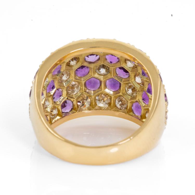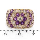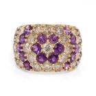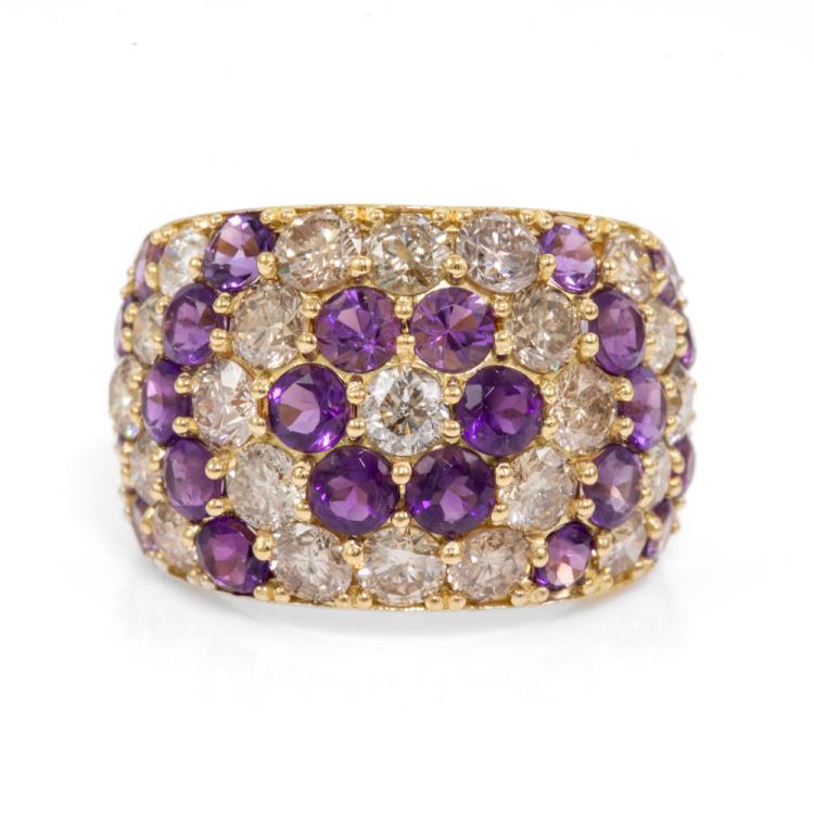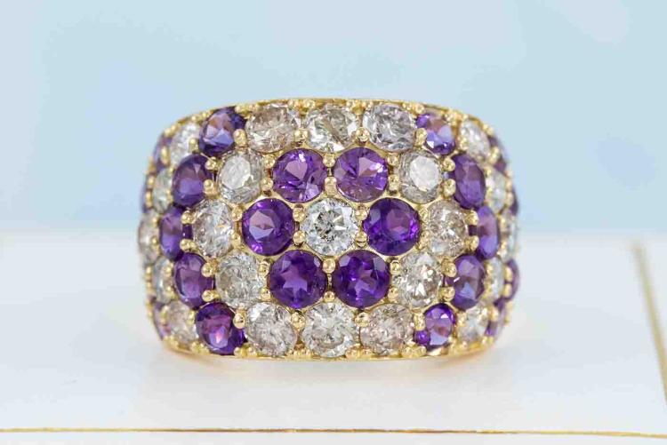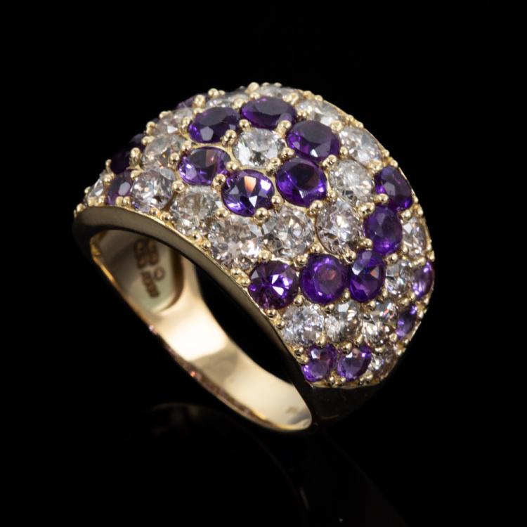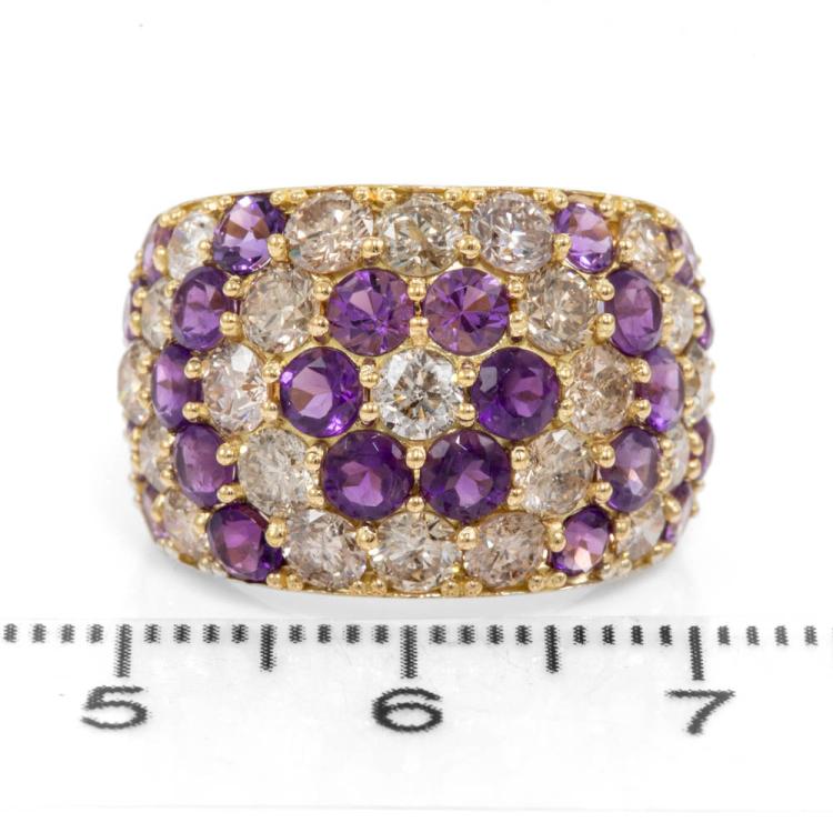 Amethyst and Diamond ring with round Natural Amethysts totalling approximately 2.70cts and round Natural Diamonds totalling approximately 2.78cts (Estimated grading: K-L SI-P1). 18ct yellow gold. Ring size L. Band width: 6.5mm - 3.7mm. Weight: 6.6g. (Pre-owned)