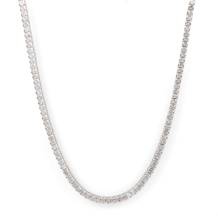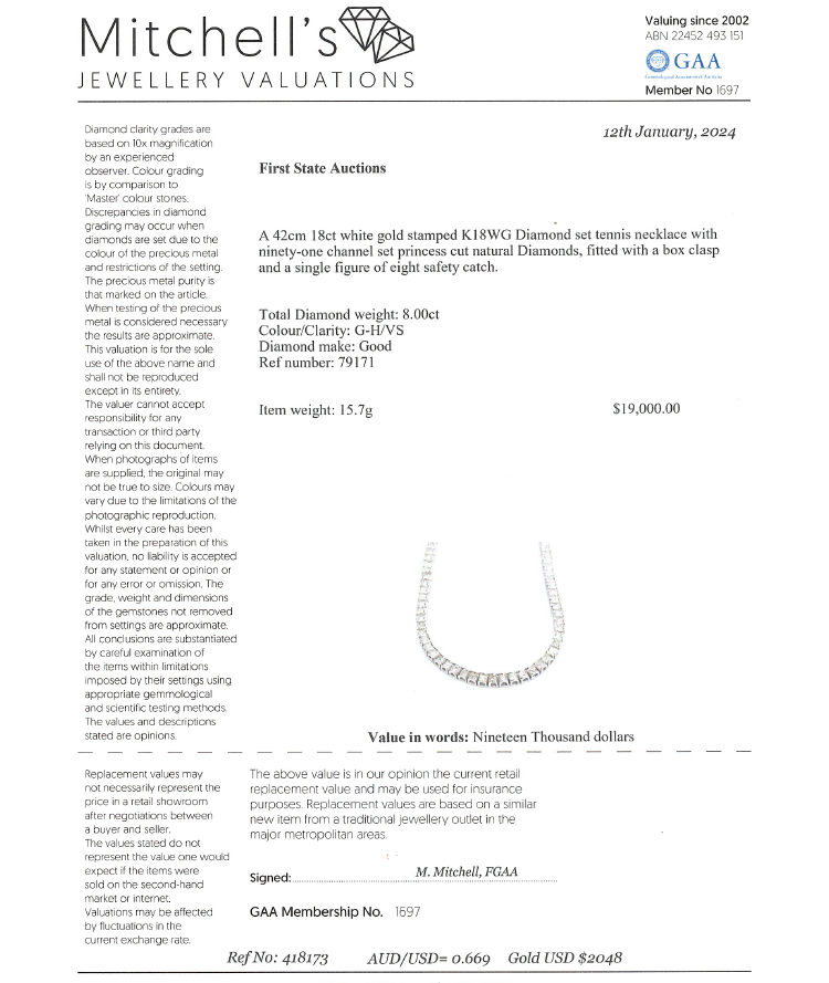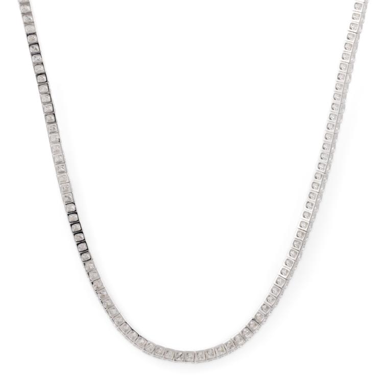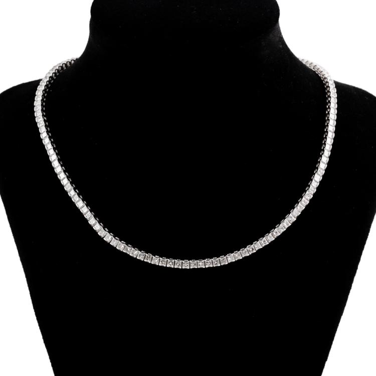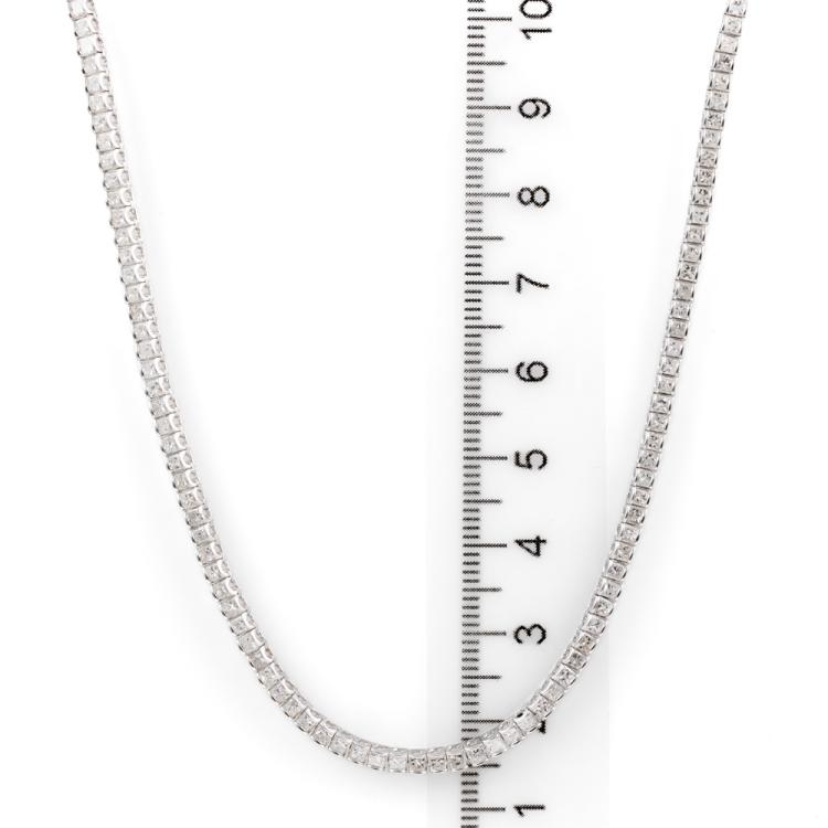 Diamond tennis necklace with princess cut Natural Diamonds totalling 8.00cts (Estimated grading: G-H VS). 18ct white gold. Length: 42cm. Weight: 15.7g. With Valuation Certificate #418173. (Pre-owned)