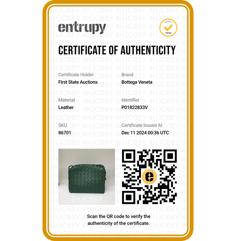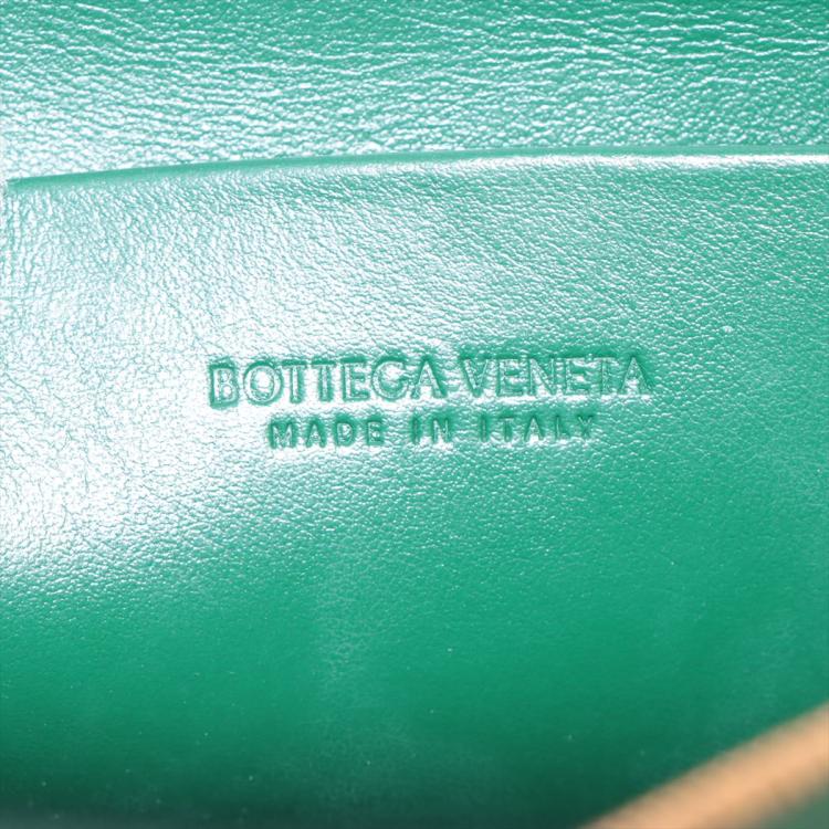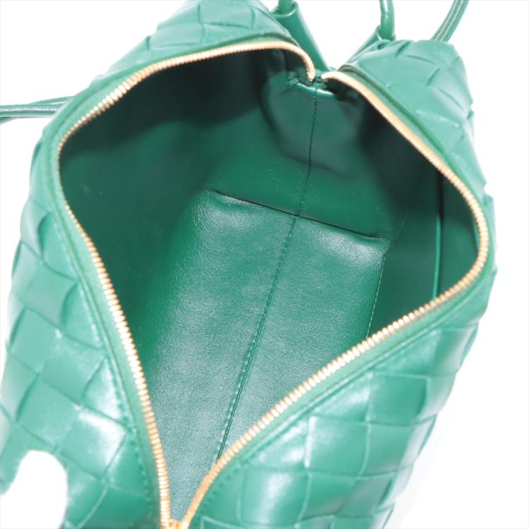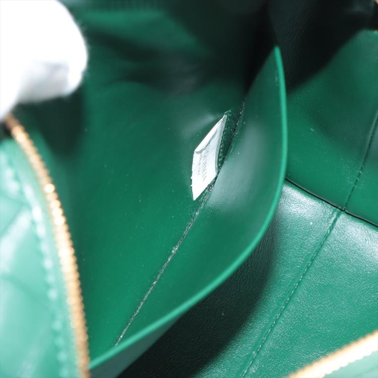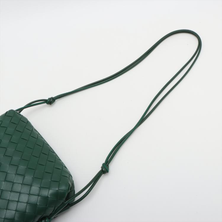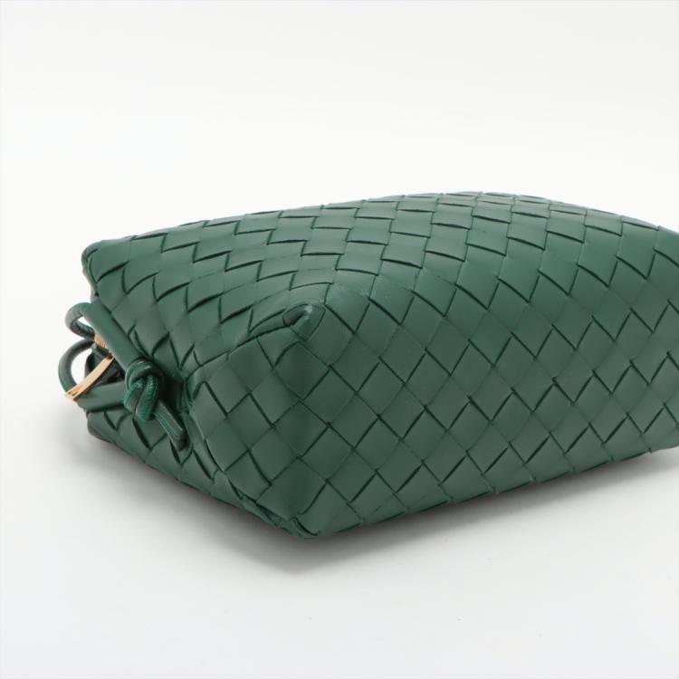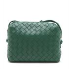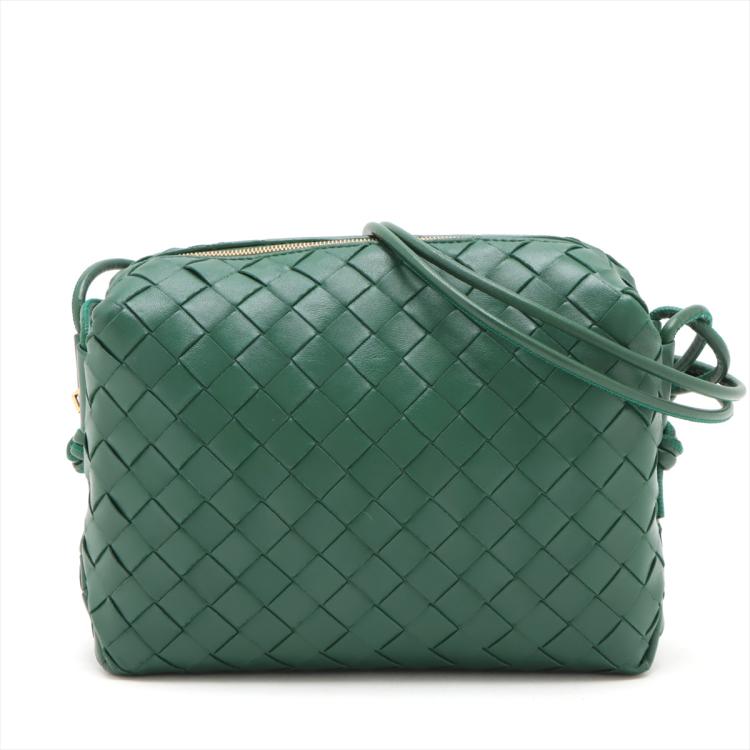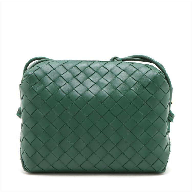Bottega Veneta small Loop camera bag in intrecciato soft lambskin leather in dark green. Featuring gold-tone hardware, knot detailing on strap, top zipper closure opens to the colour matching calfskin leather interior with a patched pocket. Approximate dimensions: 22cm(W) x 15.5cm(H) x 9cm(D), 55cm shoulder drop. Accompanied by a BV dust bag. With Entrupy Certificate of Authenticity. (Pre-owned)