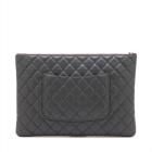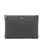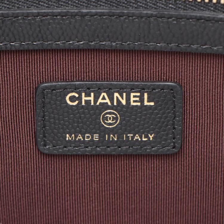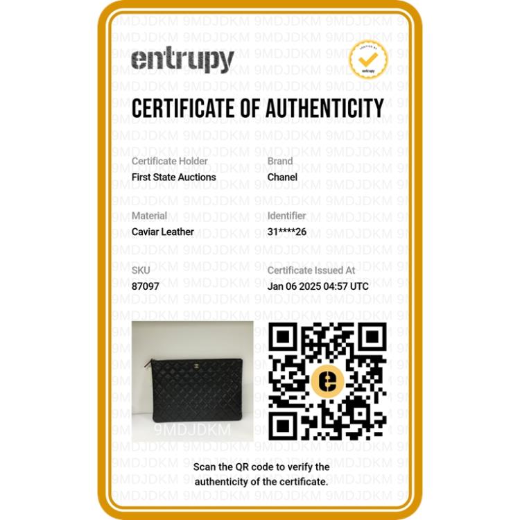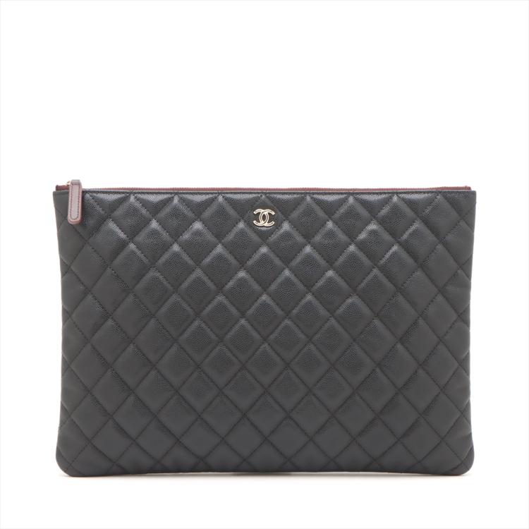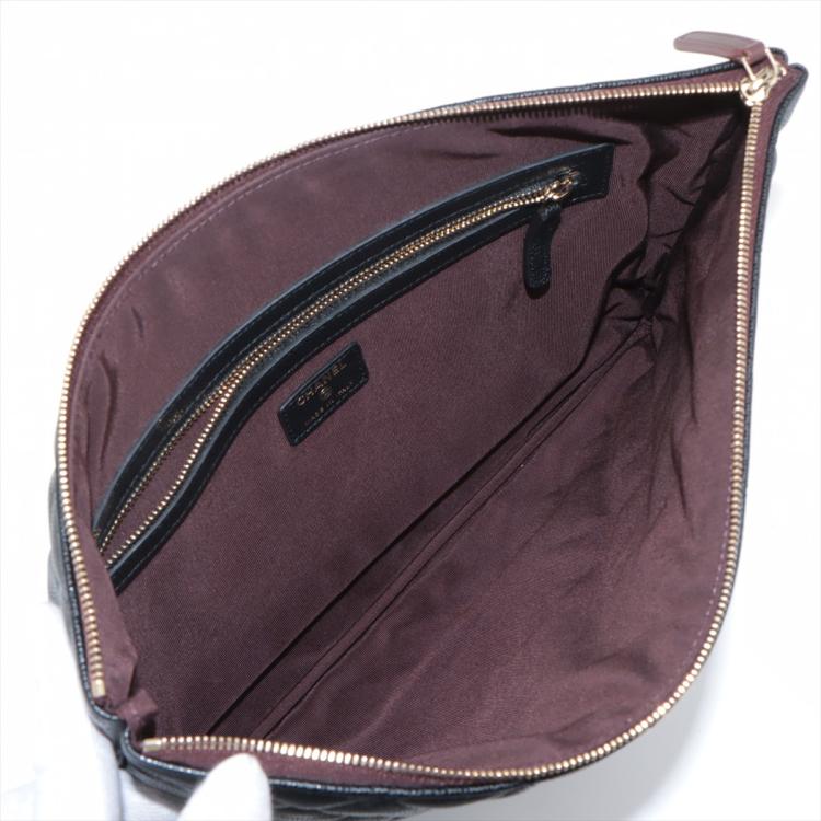 Chanel O Case clutch in black diamond-quilted caviar leather (#31xxxxxx). Featuring light gold-toned hardware and exterior back patch pocket. The zipper top opens to a burgundy textile interior with a zipper pocket. Approximate dimensions: 34cm(L) x 23.5cm(H). Accompanied by Chanel box, dustbag, and authentication card. With Entrupy Certificate of Authenticity. (Pre-owned)