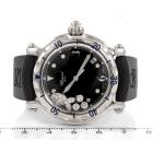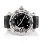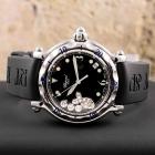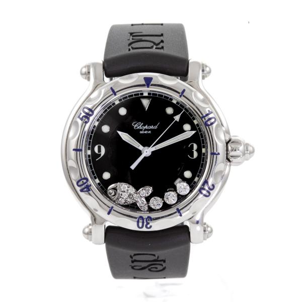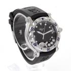 Chopard Happy Sport stainless steel quartz watch. Black dial, 3 floating Diamonds and Diamond set floating fish, date, approximate case diameter: 38mm, strap length: 19cm, Swiss made. Ref# 8347. With Chopard black rubber strap and buckle. With Certificate of Authenticity. 3 month FSA warranty (Pre-owned)