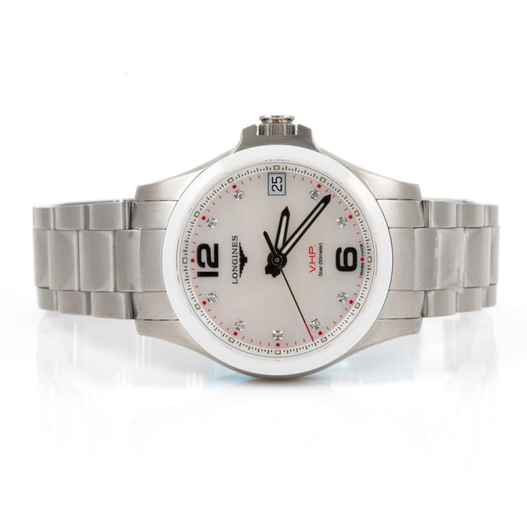 Longines Conquest stainless steel quartz watch. Mother of Pearl dial, Diamond indicators, date, case diameter: 36mm, wrist size: 19.5cm, Swiss made. Ref# L3.319.4.87.6. With Longines stainless steel bracelet and clasp. With FSA Certificate and Authenticity, Longines Diamond Certificate card and Longines box. 3 month FSA warranty (As new, Note: minor scratches on case and bracelet due to being display stock)