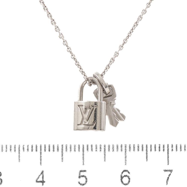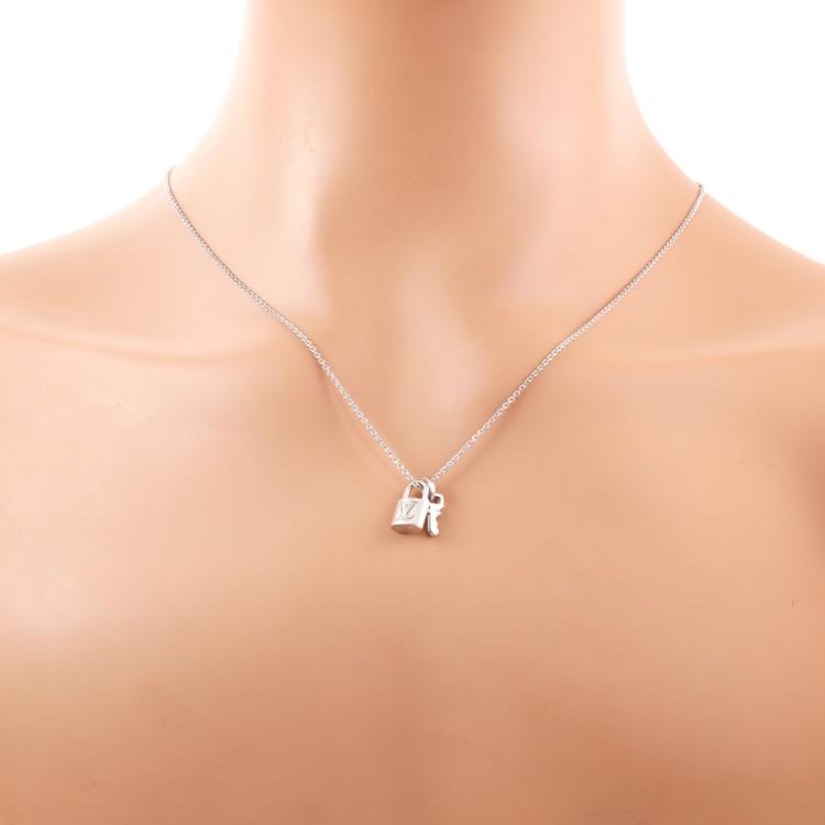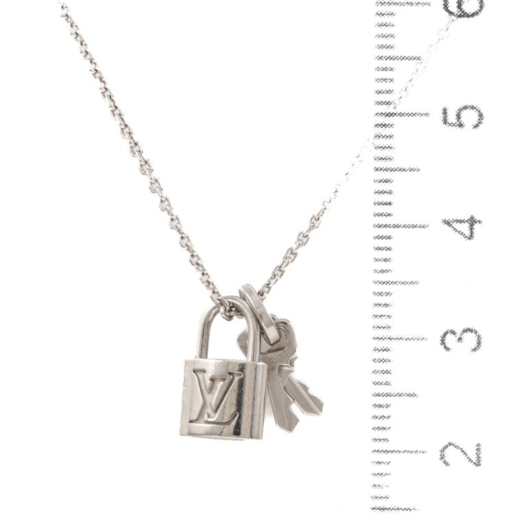 Louis Vuitton Lockit pendant with a padlock and double keys. 18ct white gold with 52.5cm Louis Vuitton 18ct white gold chain. Padlock dimensions: 12.7mm x 7.8mm. Key length: 10.3mm. Weight: 8.5g. (Pre-owned)