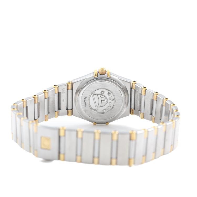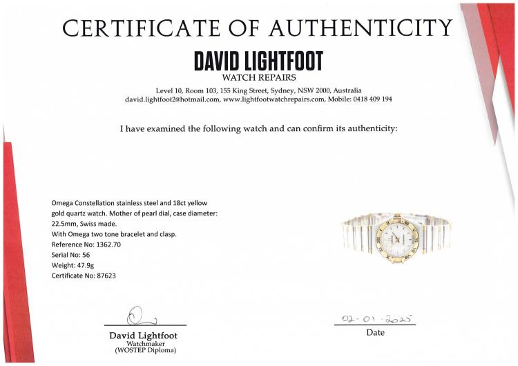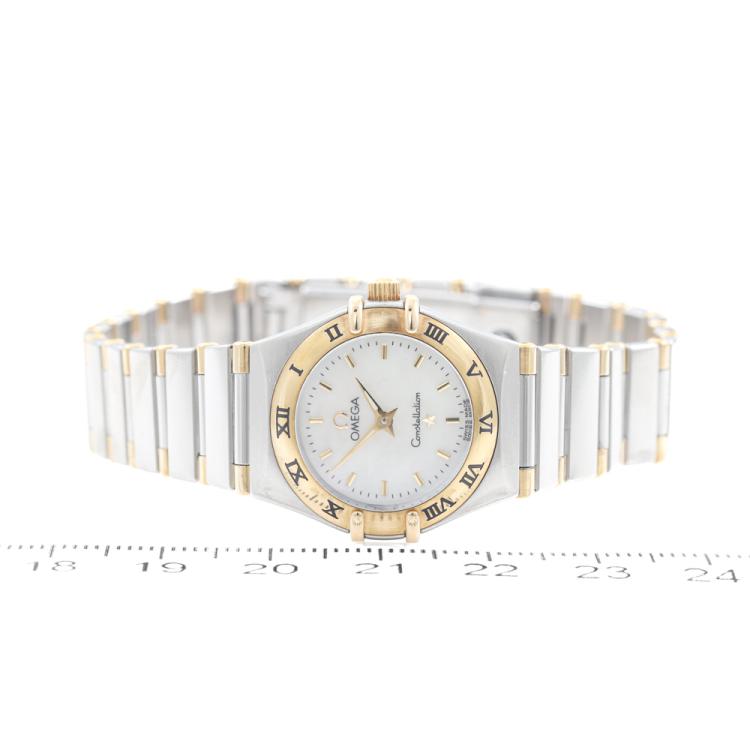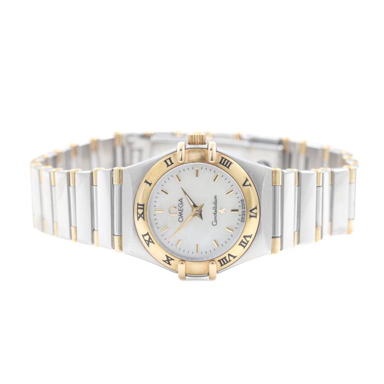 Omega Constellation stainless steel and 18ct yellow gold quartz ladies watch. Mother of pearl dial, case diameter: 22.5mm, wrist size: 17.5cm, Swiss made. Ref# 1362.70. With Omega two tone bracelet and clasp. With Certificate of Authenticity, Omega International Warranty Card dated 11/06/2000 and Omega box. 3 month FSA warranty. (Pre-owned)