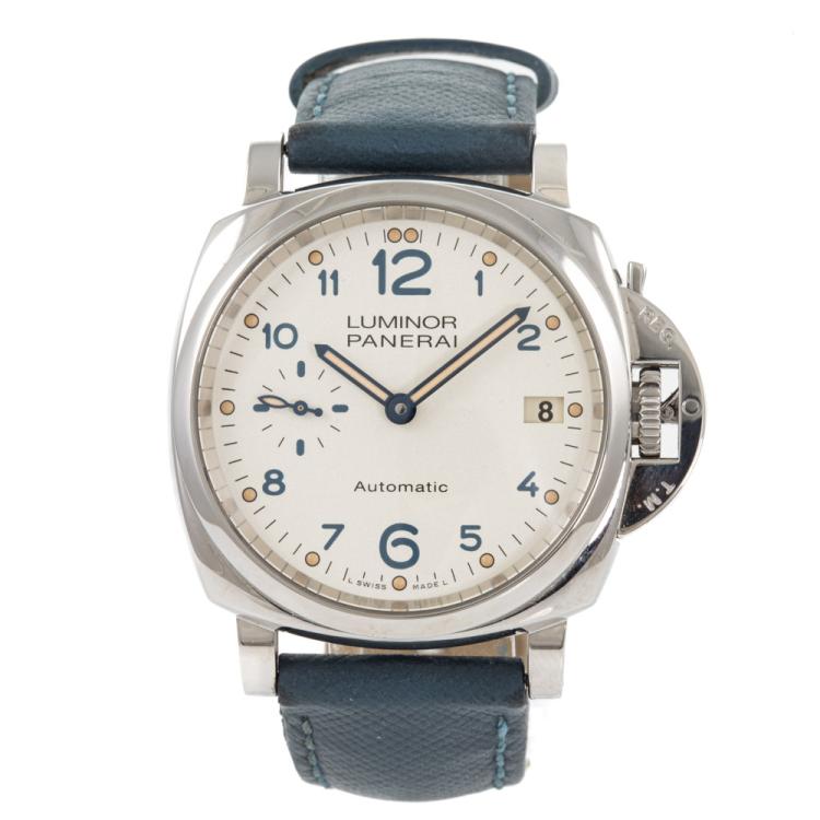 Panerai Luminor Due stainless steel automatic watch. Silver dial, date, case diameter: 38mm, strap length: 18cm, Swiss made. Ref #PAM00903. With Panerai blue leather strap and buckle. With Certificate of Authenticity. 3 month FSA warranty (Pre-owned)
