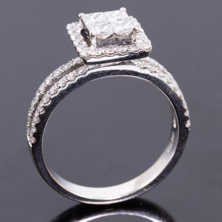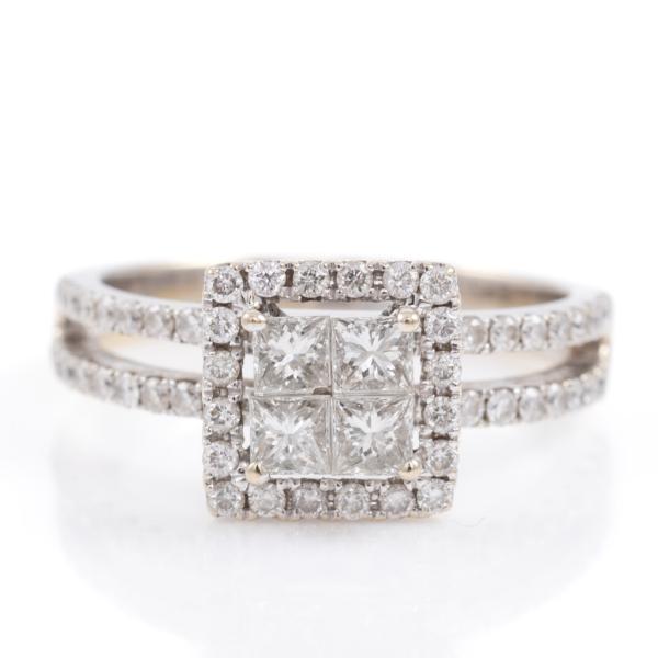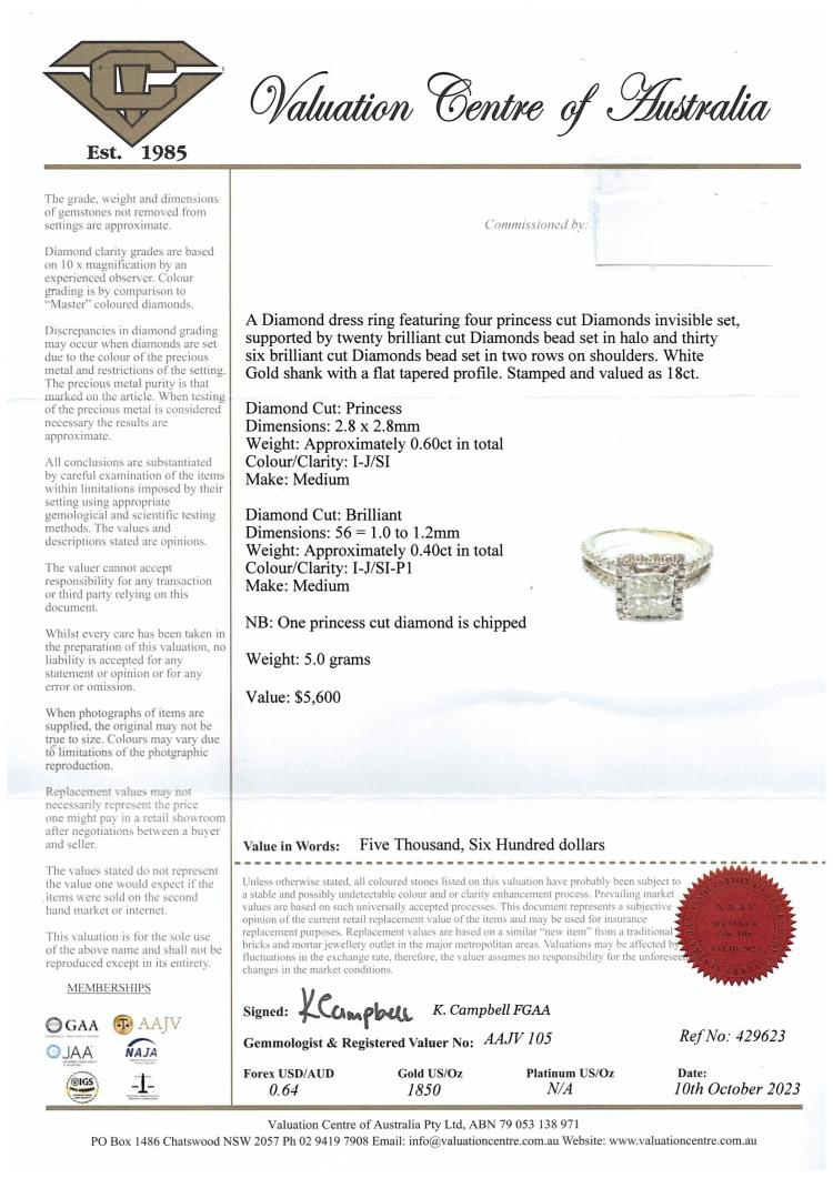 Diamond dress ring with 4 princess cut Natural Diamonds (1 chipped) totalling 0.60ct (Estimated grading: I-J SI) and round Natural Diamonds totalling 0.40cts (Estimated grading: I-J SI-P1). 18ct white gold. Ring size M - ring resizing is not recommended. minimun band width:2.8mm. Weight: 5.0g. With Valuation Certificate dated 10/10/2023. (Pre-owned)