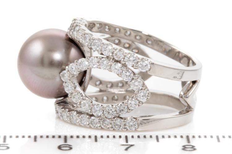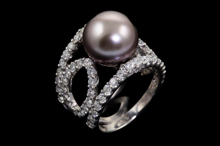 Pearl and Diamond ring with Tahitian Pearl of 12.1mm and round Natural Diamonds totalling 2.40cts (Estimated grading: H SI). Platinum - 900. Ring size L1/2 - ring resizing is not recommended. Weight: 17.3g. With Certificate #417636. (Pre-owned)