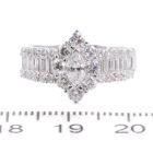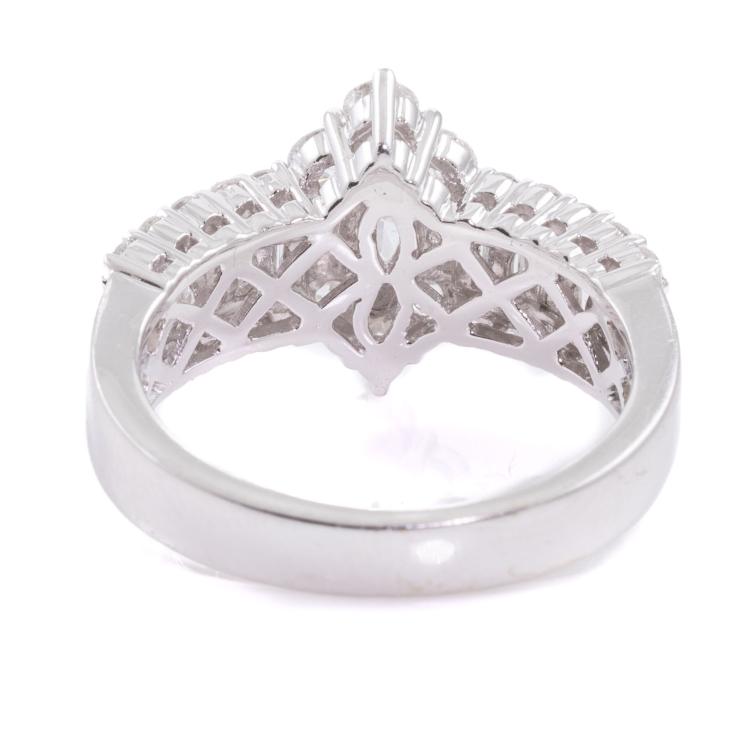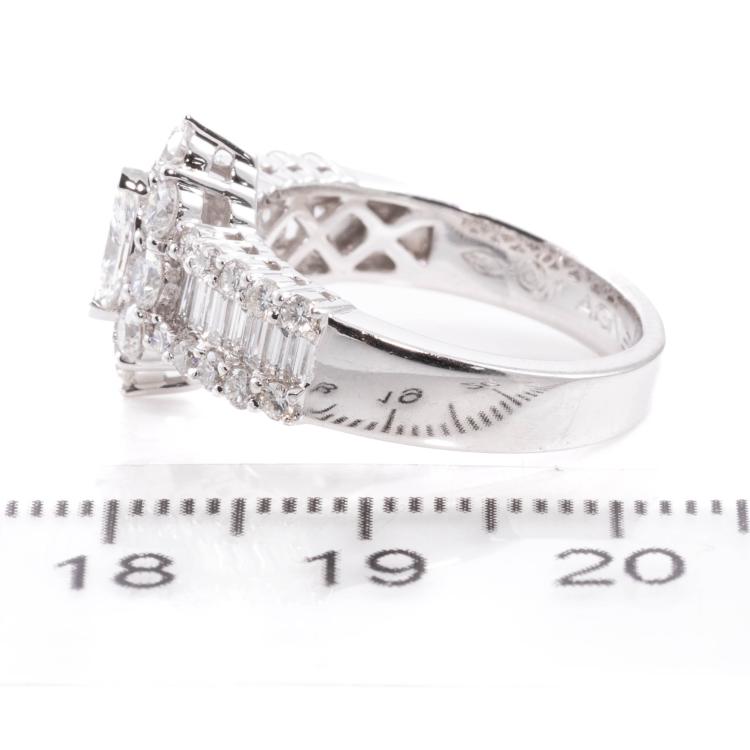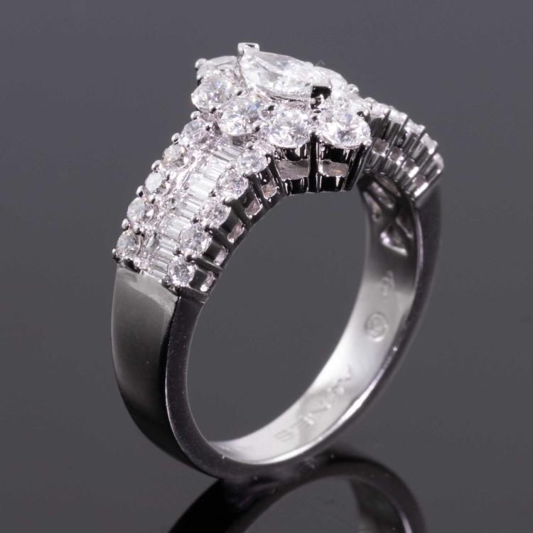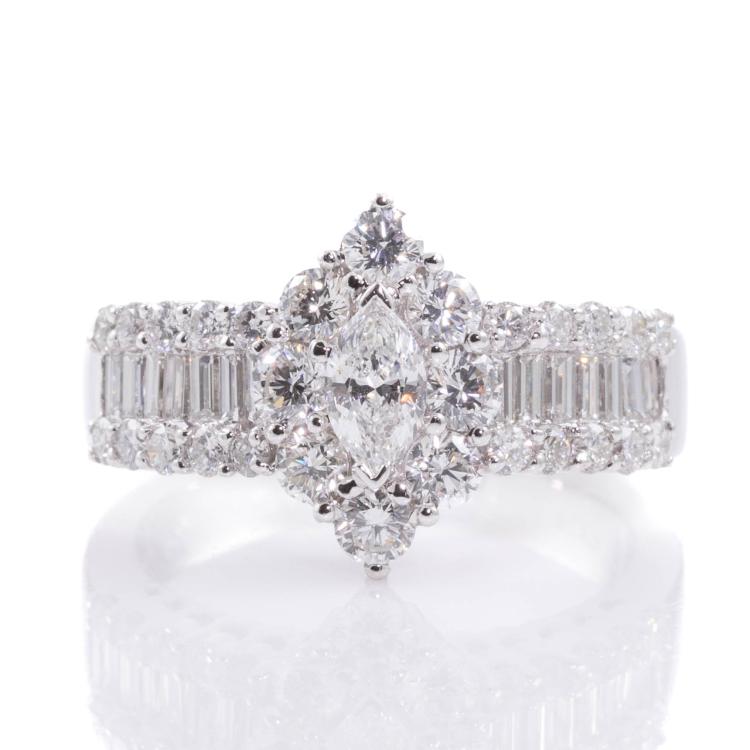 Diamond dress ring with marquise, round & baguette cut Natural Diamonds totalling 1.30cts (Estimated grading: G-H VS-SI). 18ct white gold. Ring size: K. Band width: 4.6mm - 3.3mm. Engraved: Agnes Archer. Weight: 6.2g. (Pre-Owned)