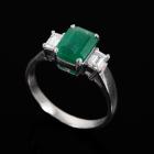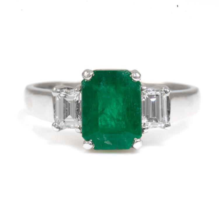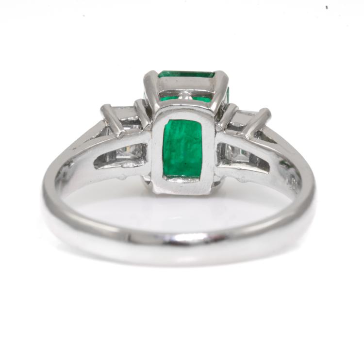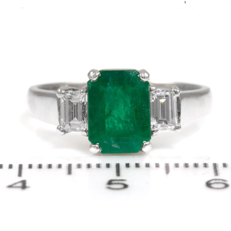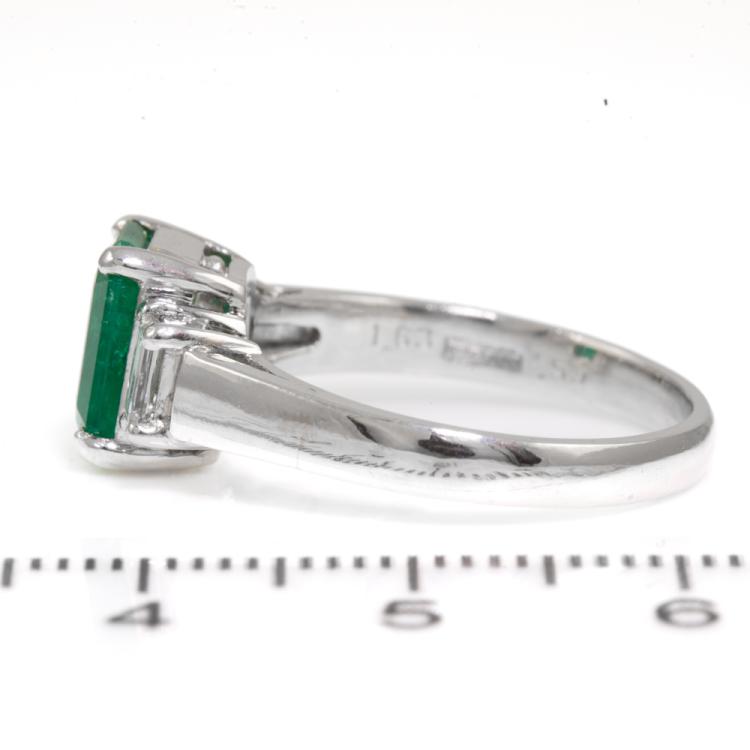 Emerald and Diamond ring with emerald cut Natural Emerald of 1.63ct and baguette cut Natural Diamonds totalling 0.55cts (Estimated grading: G-H VS-SI). Platinum 900. Ring size O. Band width: 3.5mm - 2.5mm. Weight: 6.0g. (Pre-owned)
