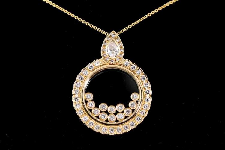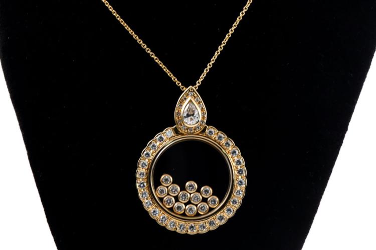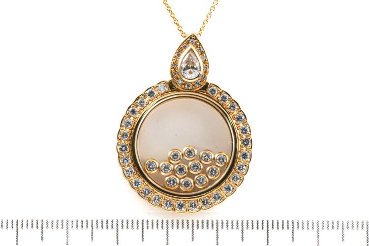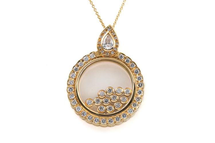Diamond pendant with a pear shape Natural Diamond of 0.40ct (Estimated grading: G SI2) and round & floating Diamonds totalling 1.24ct (Estimated grading: G-H SI). 18ct yellow gold with 18ct yellow gold 42cm chain. Weight: 15.0g (Pre-owned)