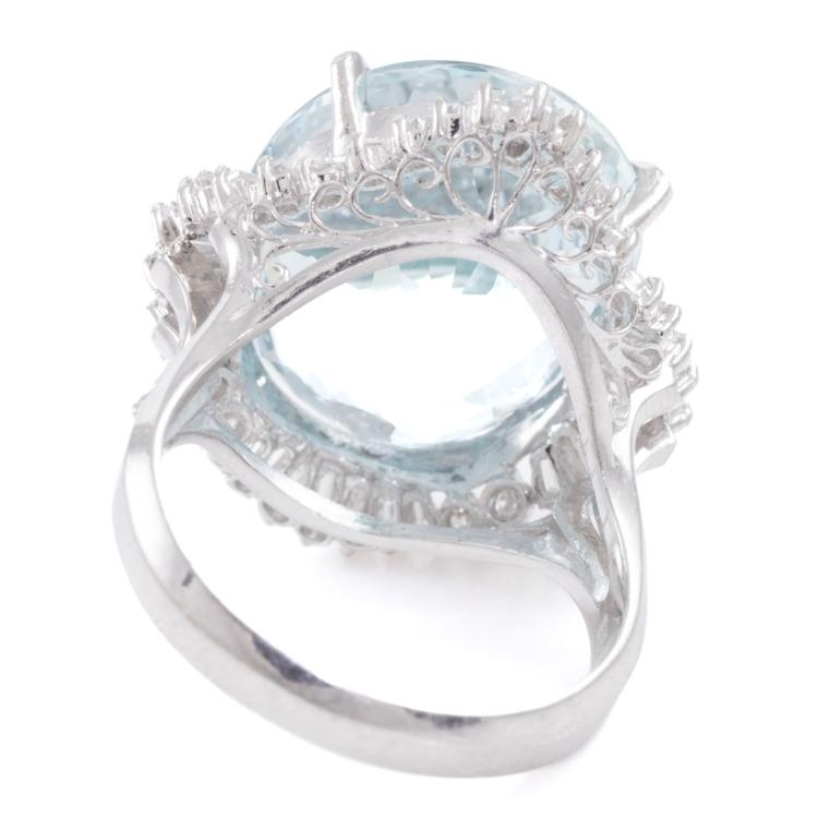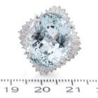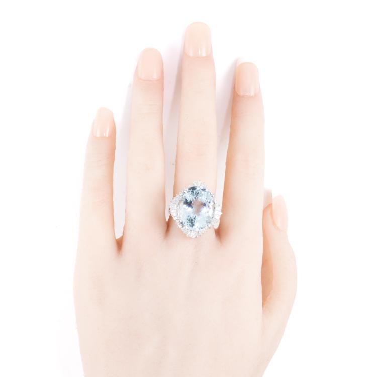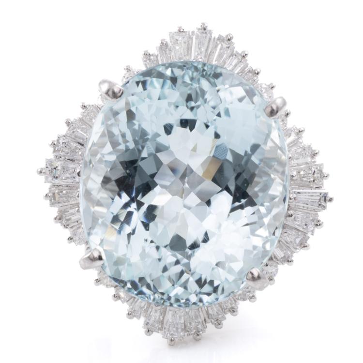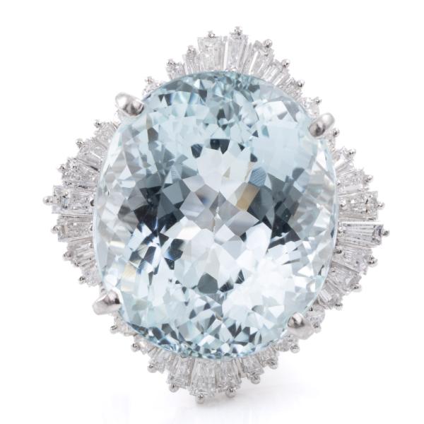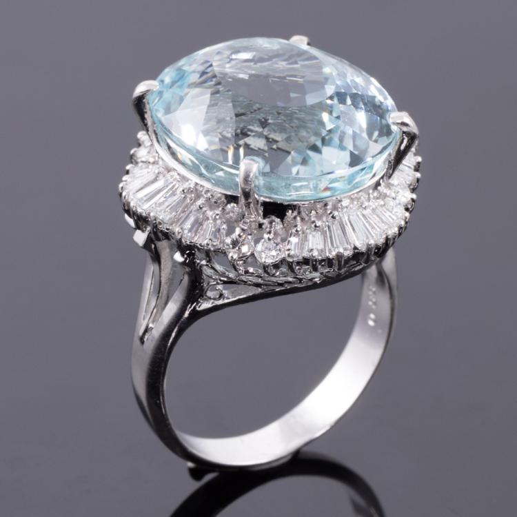 Aquamarine and Diamond ring with Natural oval Aquamarine of 17.89ct and round & baguette cut Natural Diamonds totalling 0.88cts (Estimated grading: G-H SI). Platinum 900. Ring size N. Band width: 3.5mm. Weight: 13.2g. (Pre-owned)