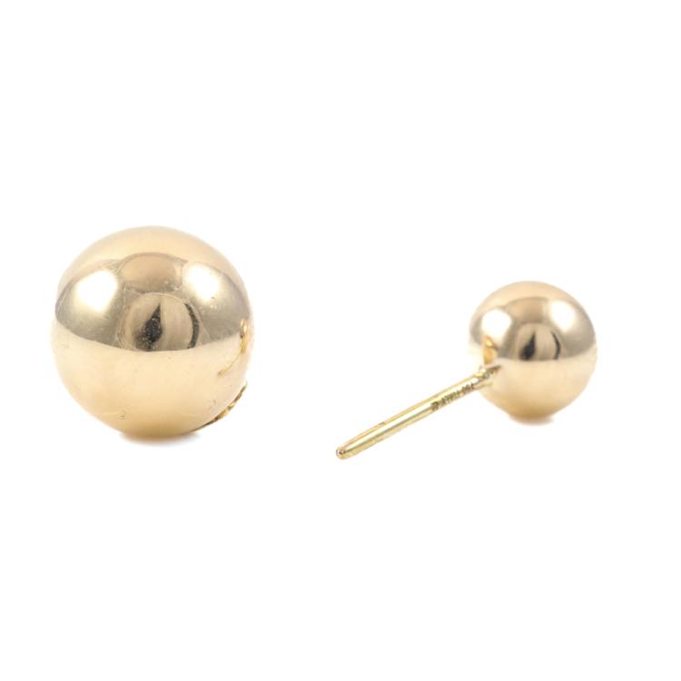Double ball stud earrings with small ball at front earlobe and larger ball at back earlobe. 18ct yellow gold. Ball diameter: 8mm & 12mm. Weight: 5.1g. (Pre-owned)