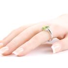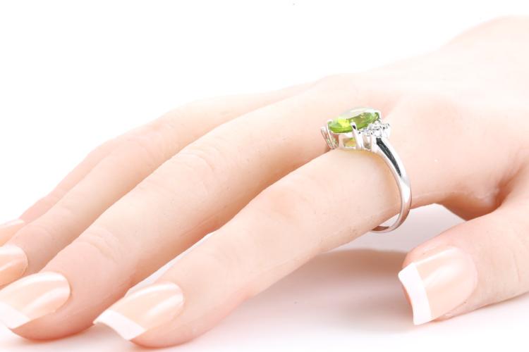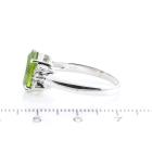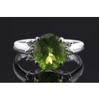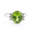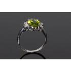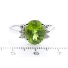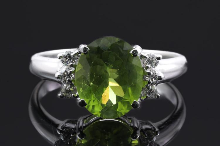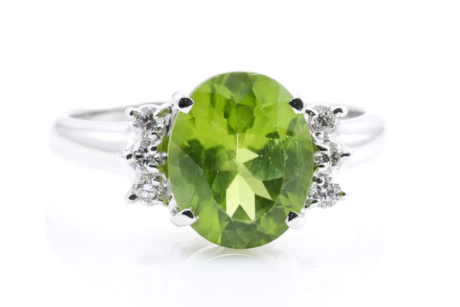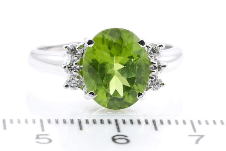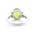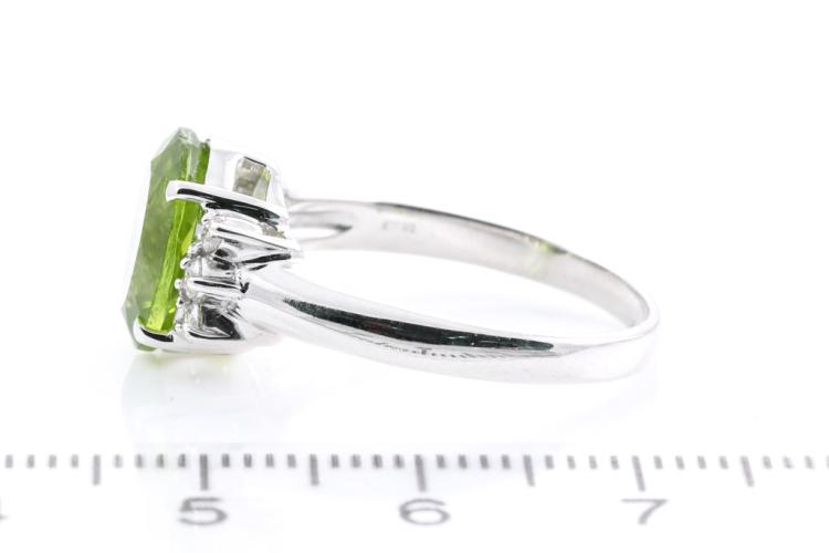 Peridot and Diamond ring with an oval shape Peridot of 3.80ct (note - wear marks on stone surface) and round Diamonds totalling 0.18cts (Estimated grading: G SI). 18ct white gold. Ring size: R. Weight: 5.9g. (Pre-owned)