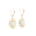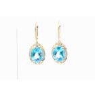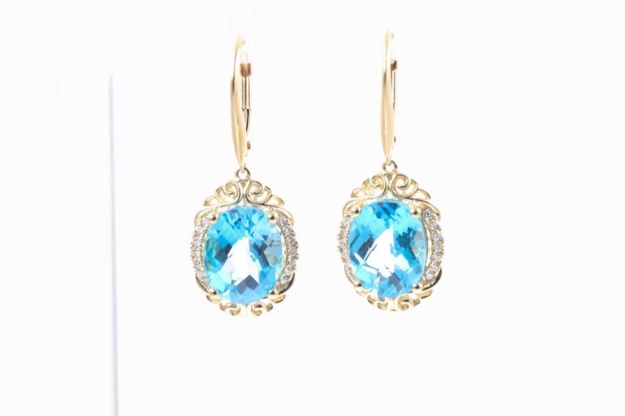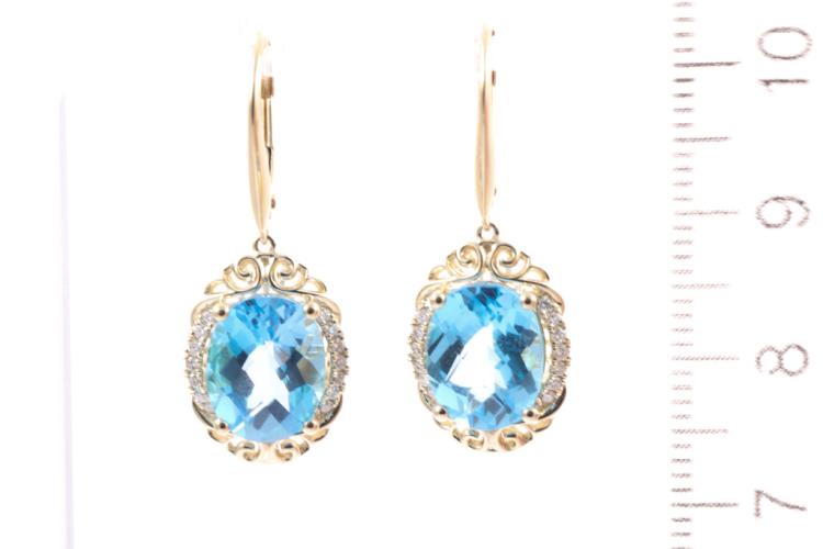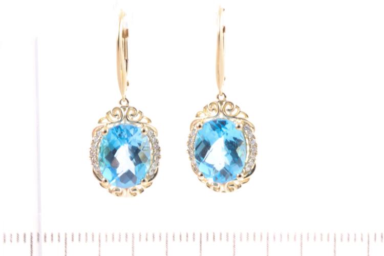 Topaz and Diamond lever back earrings with oval checkerboard cut blue Natural Topaz totalling 6.24ct and Natural Diamonds totalling 0.16cts. 14ct yellow gold. Weight: 4.5g. (New)
