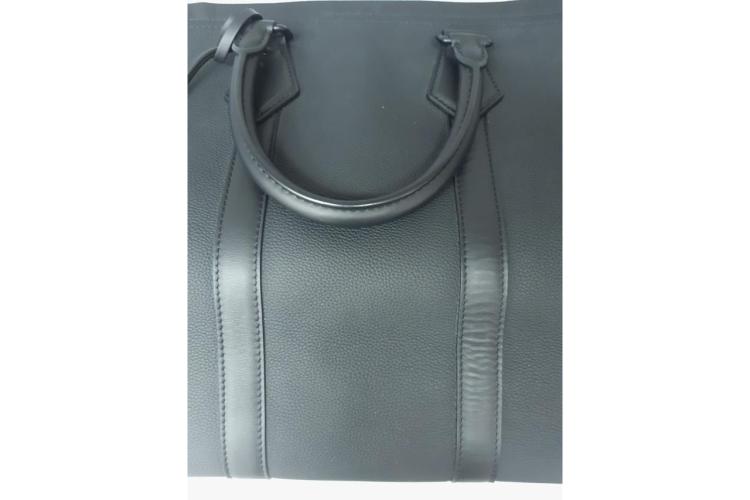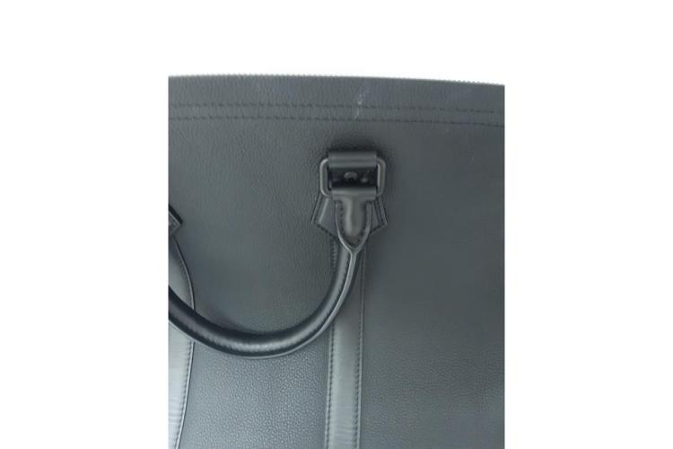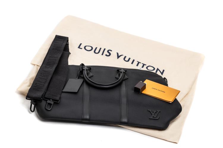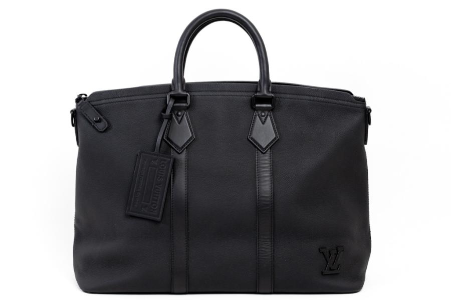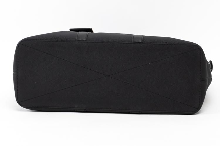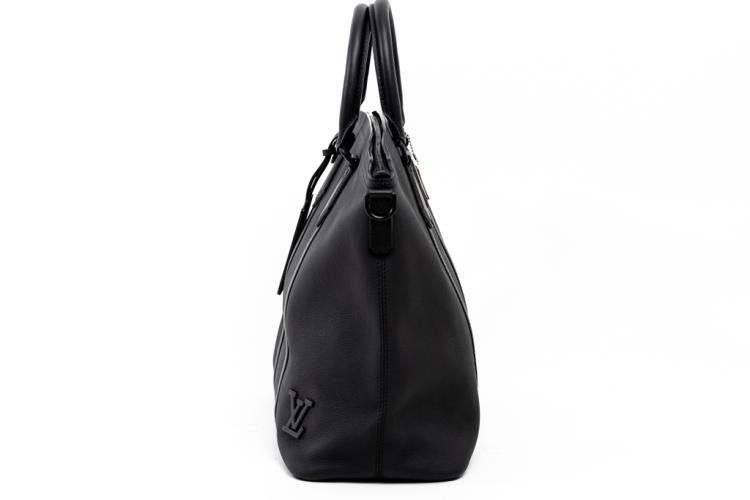 Louis Vuitton Lock it tote in grained black calf leather. Featuring cowhide-leather trim, dual smooth leather handles, black-toned hardware, zippled closure on top and functional lock on the side. The top opens to a textile lining interior with 2 flat pockets. Approximate dimensions: 43cm(W) x 33.5cm(H) x 16cm(D), 11cm handle drop and 62cm max strap drop. Accompanied by LV leather tag, padlock, keys and a dust bag. With Entrupy Certificate of Authenticity. (Pre-owned)