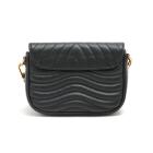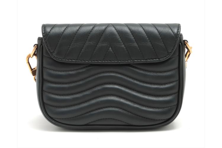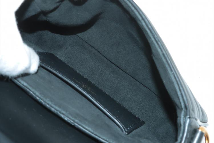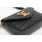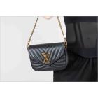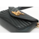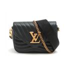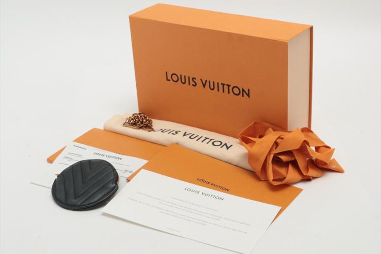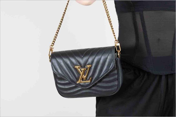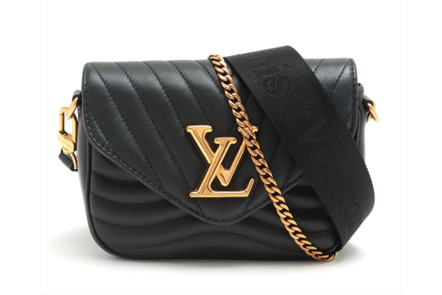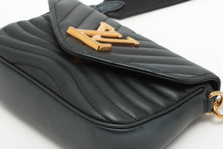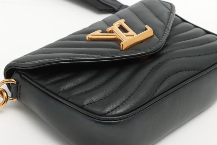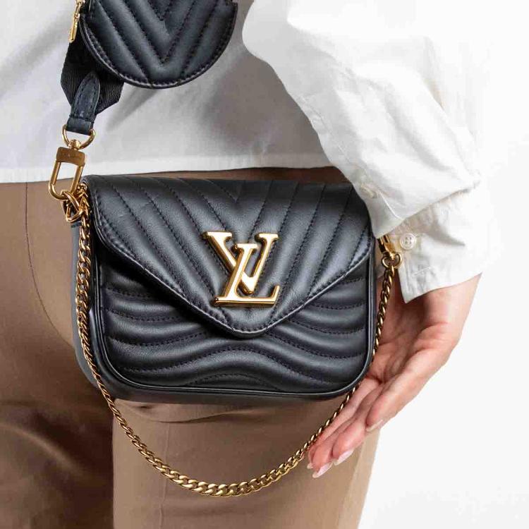 Louis Vuitton New Wave Multi Pochette shoulder bag in black quilted calfskin leather. Featuring interchangeable straps: one monogram canvas shoulder strap, and the other a short gold metal chain. With gold-hardware, including a magnetic snap closure. This opens to a black microfiber interior with a patch pocket. With a LV box, dustbag, detachable leather pouch. Approximate dimensions: 18cm(L) x 14cm(H) x 4.5cm(D). With Entrupy Certificate of Authenticity. (Pre-owned)