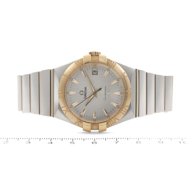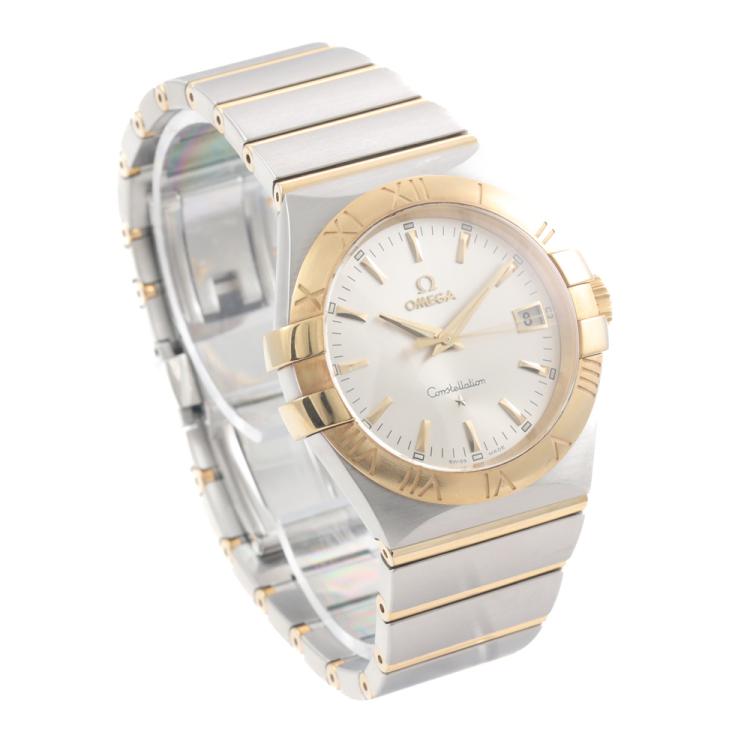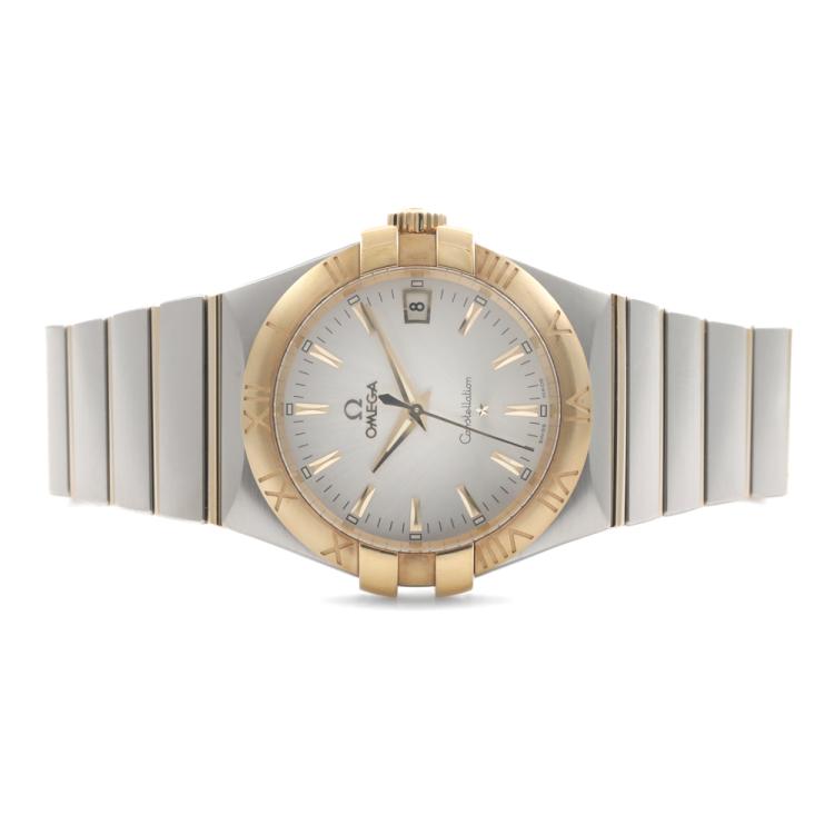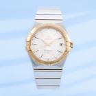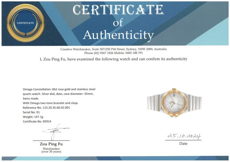 Omega Constellation 18ct rose gold and stainless steel quartz watch. Silver dial, date, case diameter: 35mm, wrist size: 16cm, Swiss made. Ref# 123.20.35.60.02.001. With Omega two-tone bracelet and clasp. With Certificate of Authenticity. 3 month FSA warranty. (Pre-owned)