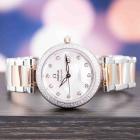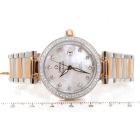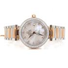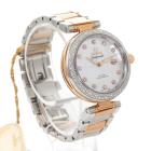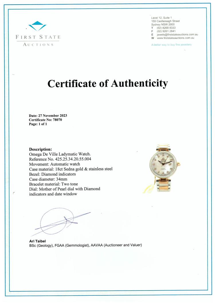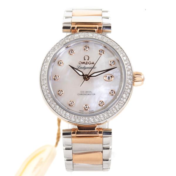 Omega De Ville Ladymatic 18ct Sedna gold and stainless steel automatic ladies watch. Mother of Pearl dial, date, Diamond set indicators & bezel, case diameter: 34mm, wrist size: 17cm, Swiss made. Ref# 425.25.34.20.55.004. With Omega two-tone bracelet and clasp. With FSA Certificate of Authenticity. 3 month FSA warranty. (As New, NOTE: very minor scratches present due to being display stock)